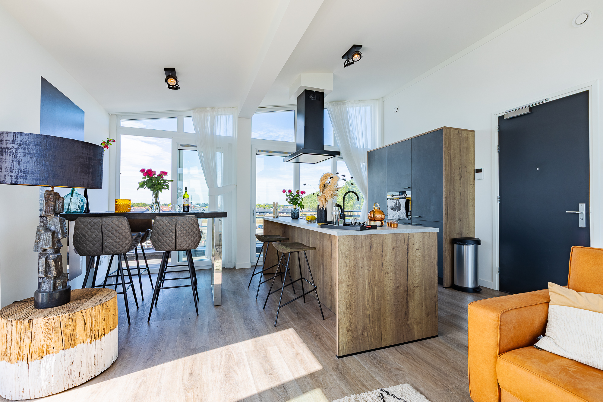 Ontworpen met ontspanning in het achterhoofd, biedt dit stijlvolle penthouse een gezellige en goed ingerichte leefruimte. De woonkamer is voorzien van een gezellige driezitsbank, een aparte fauteuil en een flatscreentelevisie - ideaal om tot rust te komen na een dagje uit. De open keuken is volledig uitgerust met moderne gemakken, waaronder een inductiekookplaat, combimagnetron en oven, koel-vriescombinatie, vaatwasser en broodrooster. Een filterkoffiezetapparaat en waterkoker zorgen ervoor dat je kunt genieten van warme dranken wanneer je maar wilt.