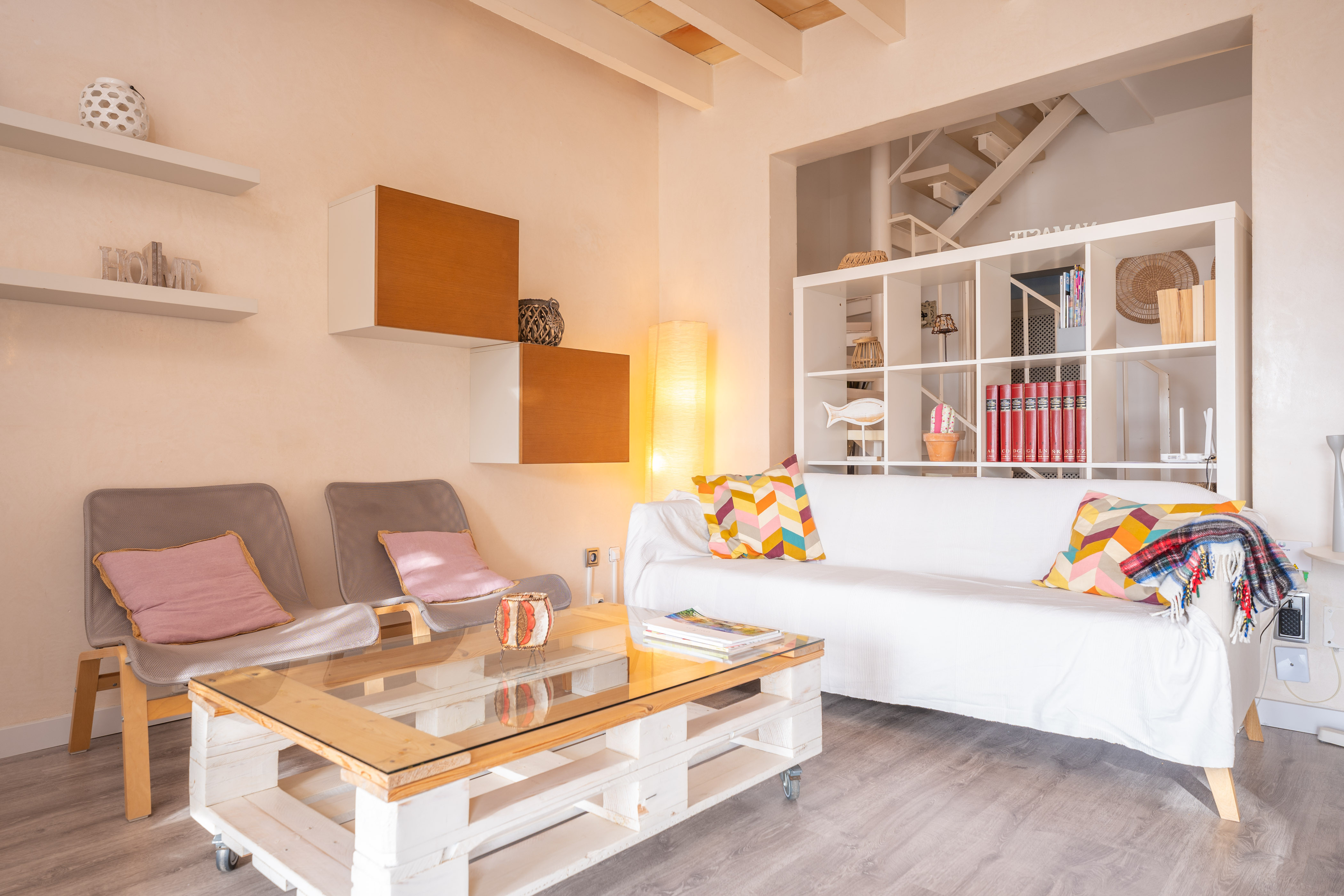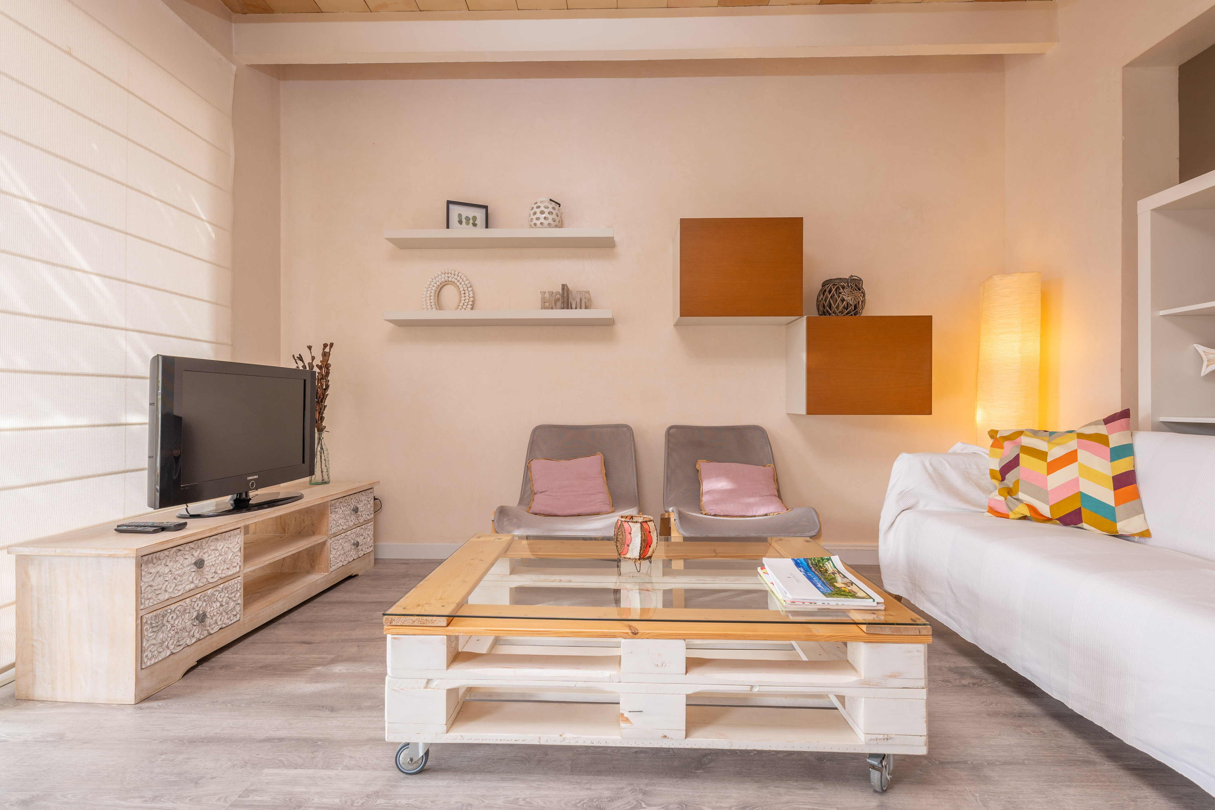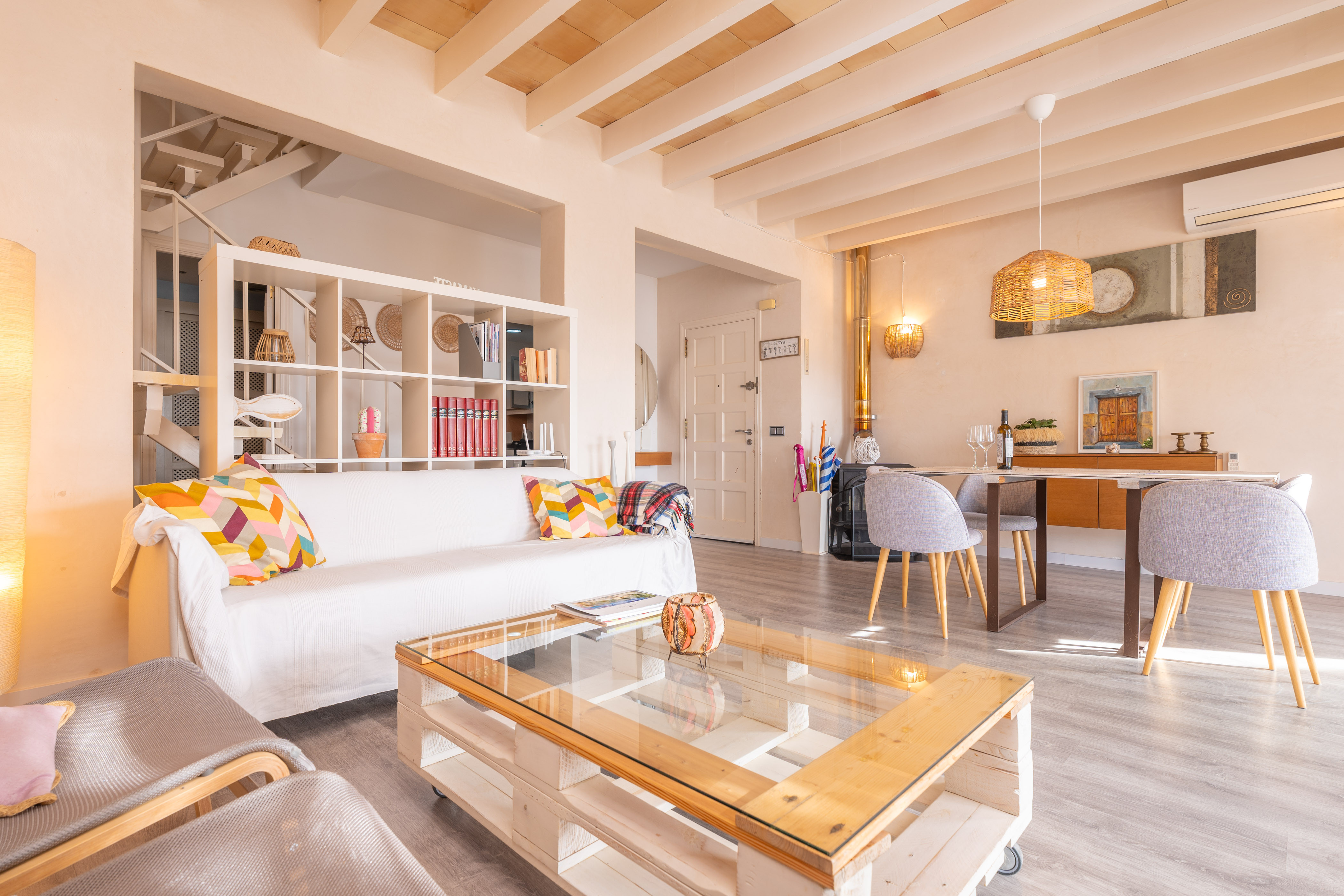 Om dit moderne appartement te bereiken, moet je een steile trap vanaf de straat oplopen. Het interieur van het appartement is verdeeld over twee verdiepingen. Op de begane grond vind je de woonkamer met eethoek, airconditioning en satelliet-tv. Ernaast is de volledig uitgeruste keuken met een keramische kookplaat. Een gasten toilet maakt deze verdieping compleet. Op de eerste verdieping bevinden zich de drie slaapkamers: twee met een tweepersoonsbed en één met twee eenpersoonsbedden. Twee van de slaapkamers hebben airconditioning, en één heeft een en-suite badkamer met douche. Een tweede badkamer met een bad rondt deze verdieping af. Indien gewenst, kunnen we een kinderbedje en een kinderstoel plaatsen als je met je baby reist. Het appartement is ook uitgerust met een wasmachine, strijkijzer en strijkplank.