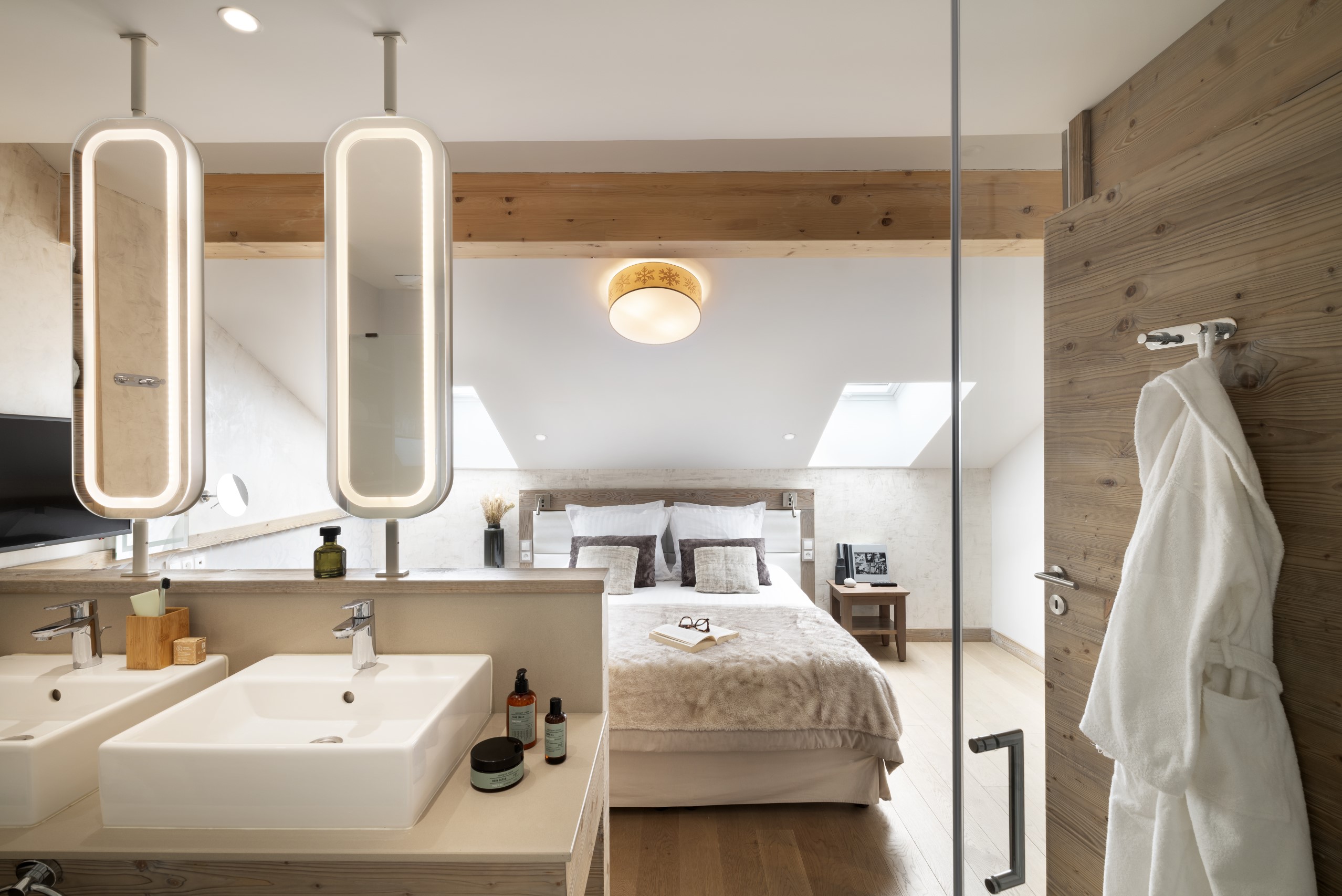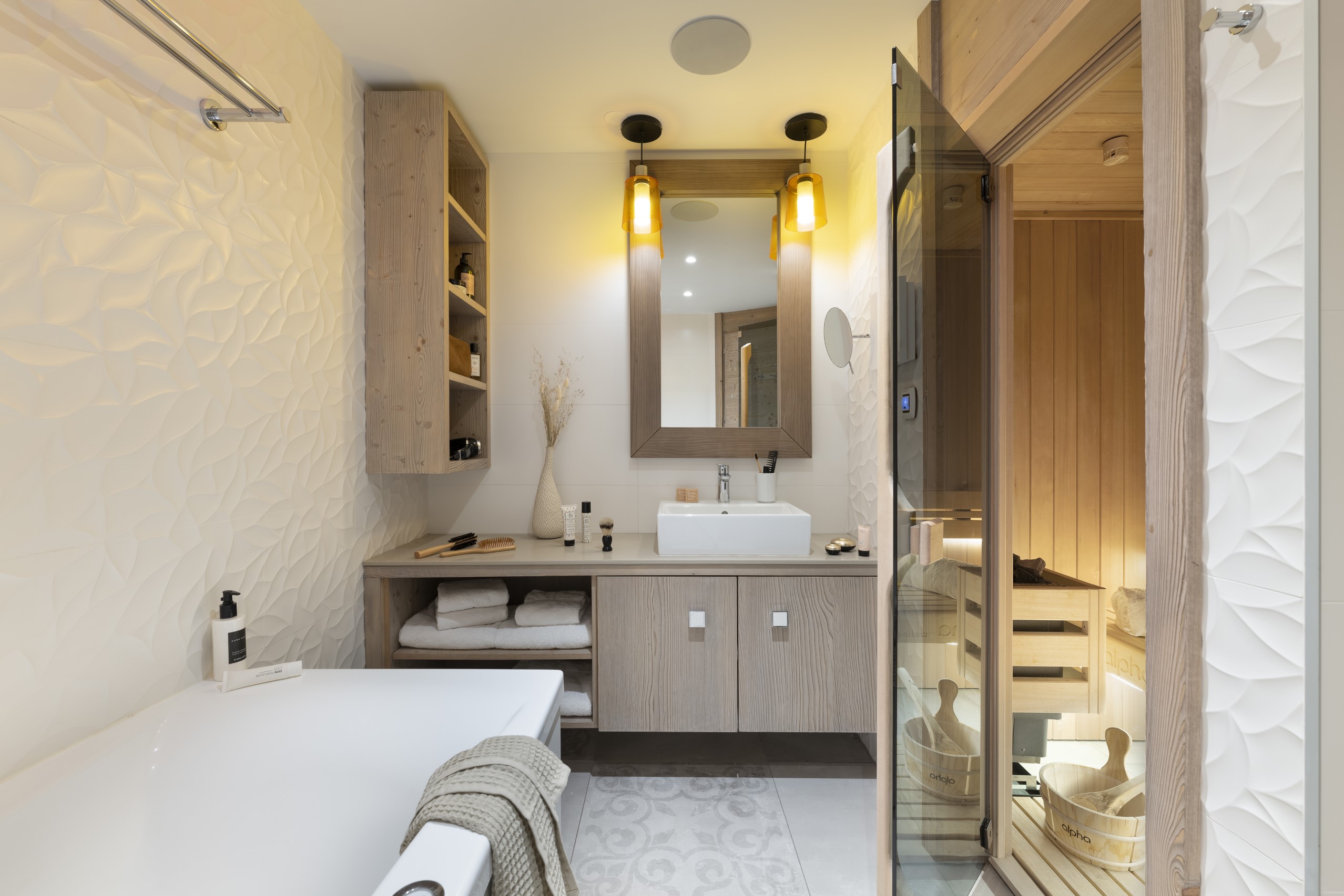 - Badkamerfaciliteiten: 2 doucheruimtes, waarvan één grenzend aan de hoofdslaapkamer, 1 badkamer met sauna en bubbelbad en 2 aparte toiletten