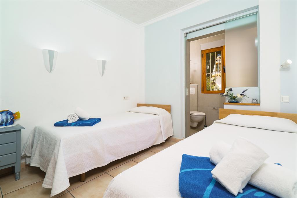 • slaapkamer met 2 eenpersoonsbedden en en-suite badkamer