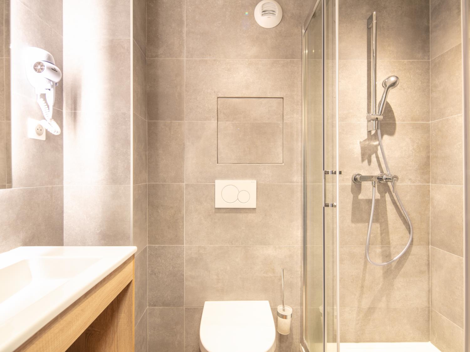 Een badkamer met douche en haardroger, plus een apart toilet.