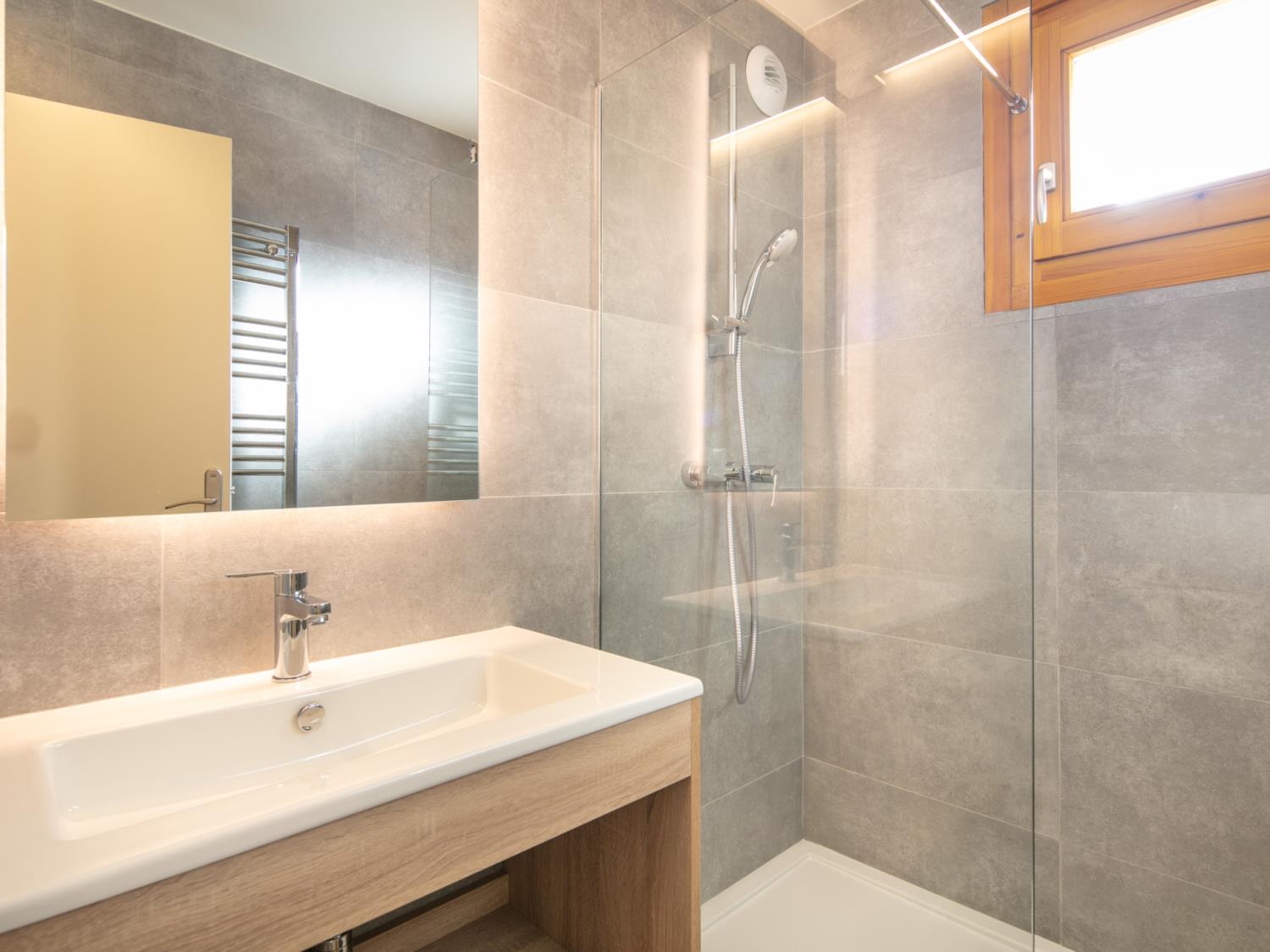 De badkamer omvat een douche en een haardroger, plus een apart toilet.
