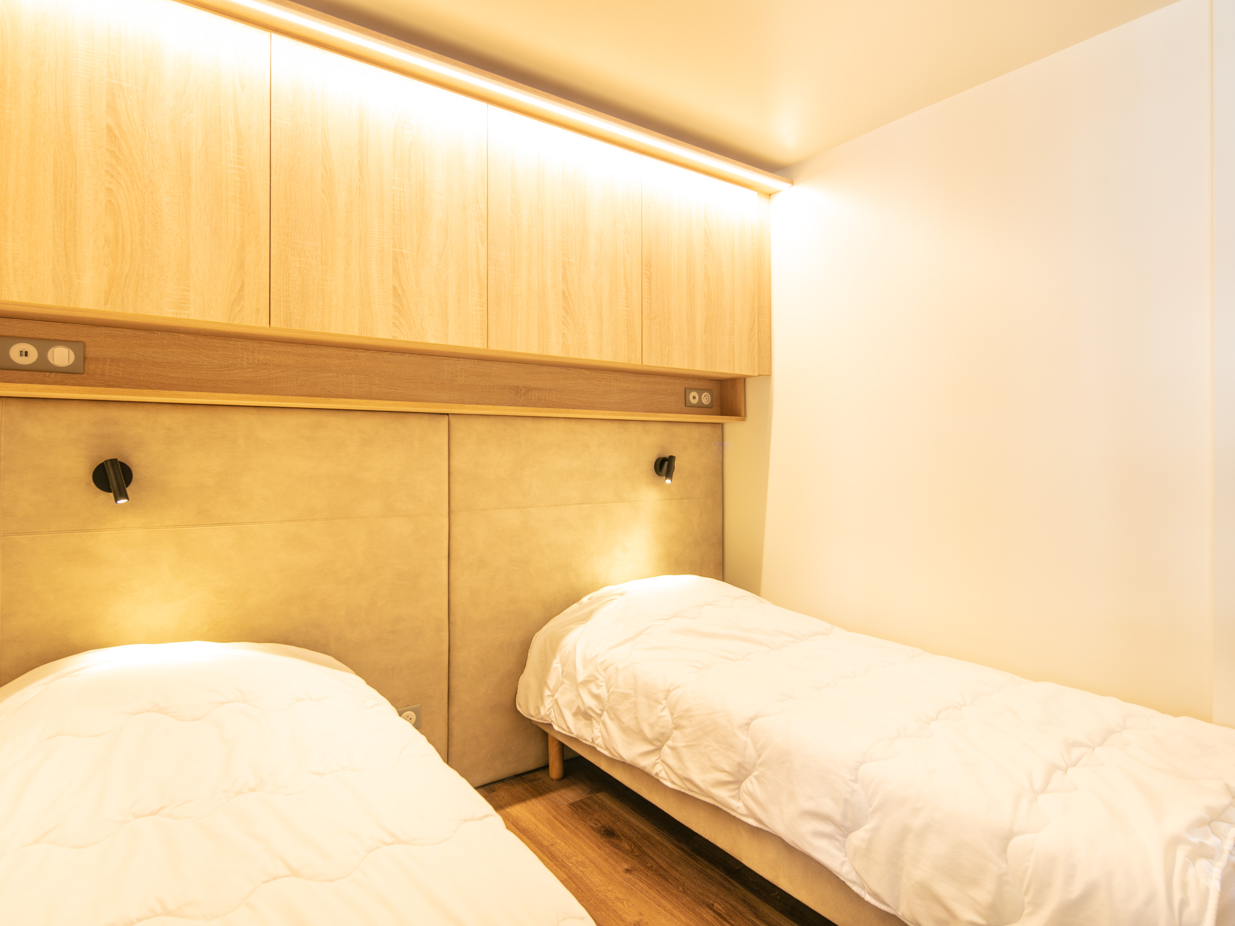 Er zijn twee slaapkamers, elk met twee eenpersoonsbedden, plus een extra slaaphoek met twee eenpersoonsbedden.