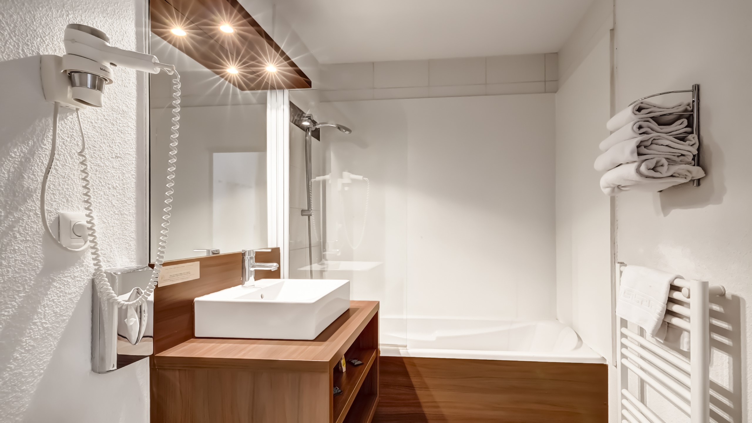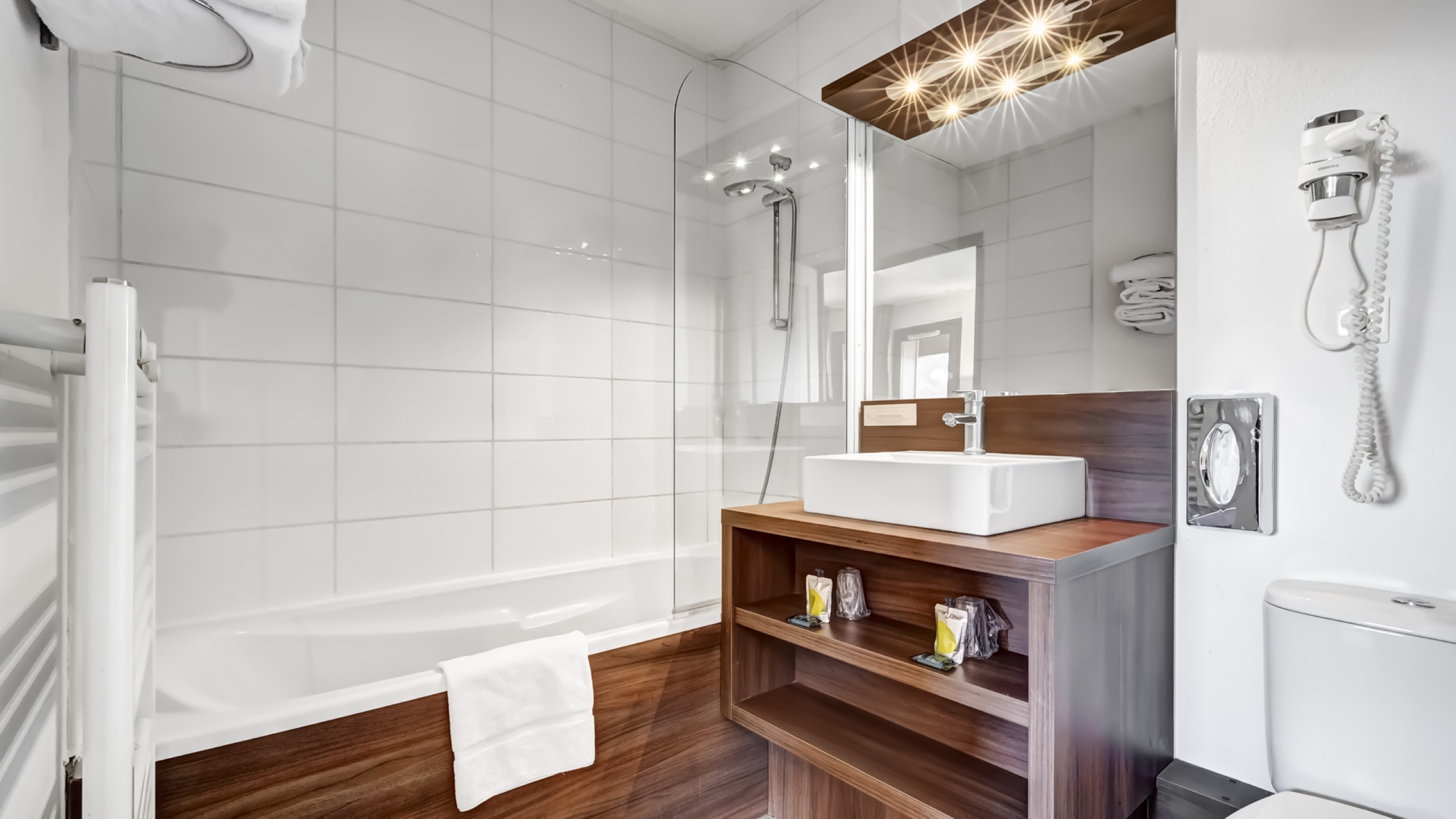 - Badkamer met bad of douche, haardroger en apart of geïntegreerd toilet