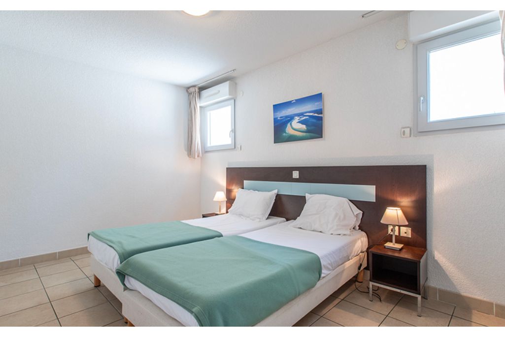 -Een slaapkamer appartement met woonkamer, slaapkamer met tweepersoonsbed, kamer met stapelbedden