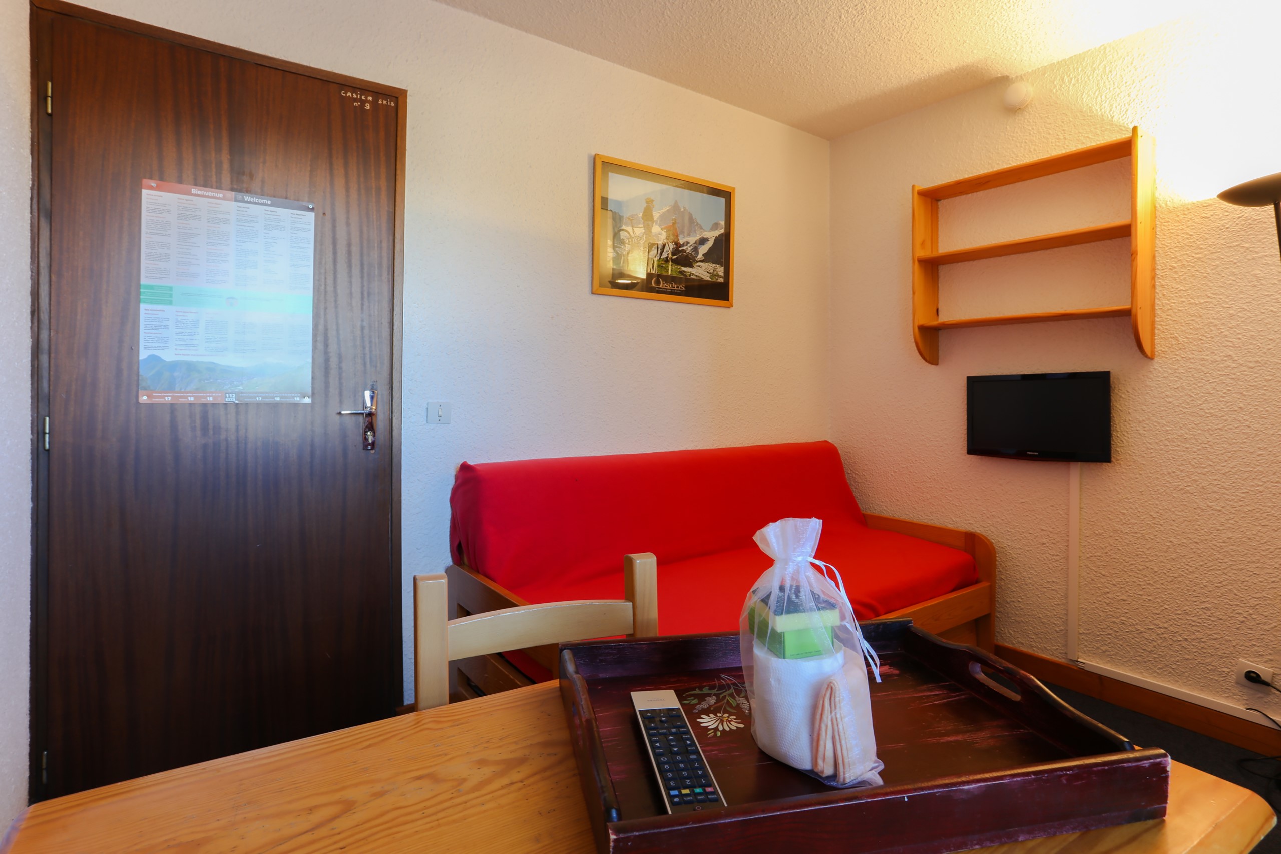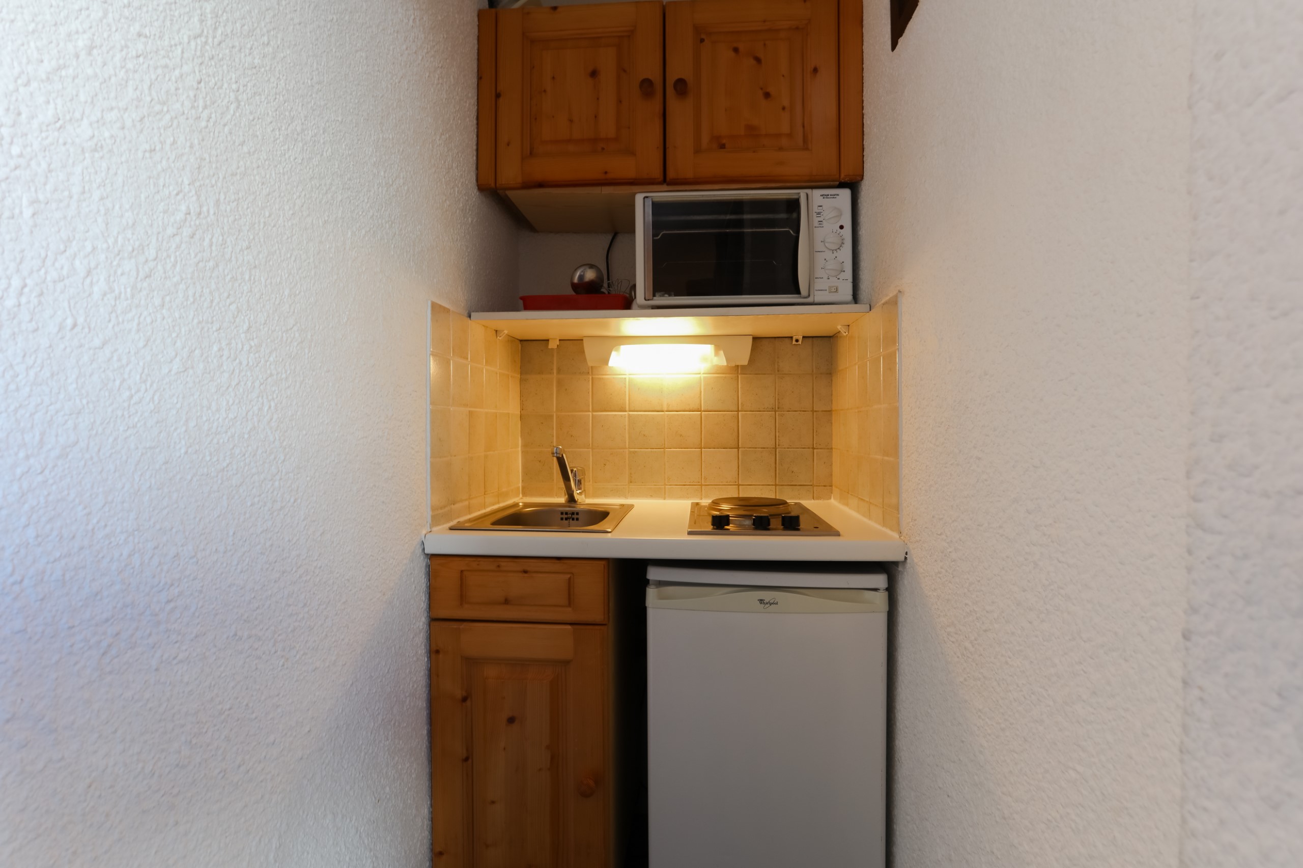 Deze compacte en functionele studio van 13 m² is zorgvuldig ontworpen om twee gasten comfortabel te huisvesten. Het woongedeelte heeft een uitschuifbare slaapbank die twee slaapplaatsen biedt, samen met een tv om te ontspannen na een dag op de piste.