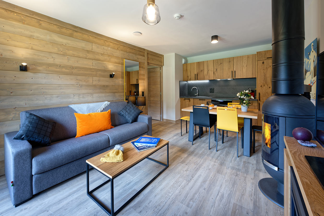 Woonkamer met slaapbank voor 2 personen, flatscreen televisie uitgerust met TNT, open haard (afhankelijk van appartement). Open keuken met keramische kookplaat, vaatwasser, combimagnetron, koelkast, koffiezetapparaat, broodrooster, waterkoker. Badkamer met bad en/of douche, uitgerust met een handdoekdroger en een haardroger. Aparte toiletten.
