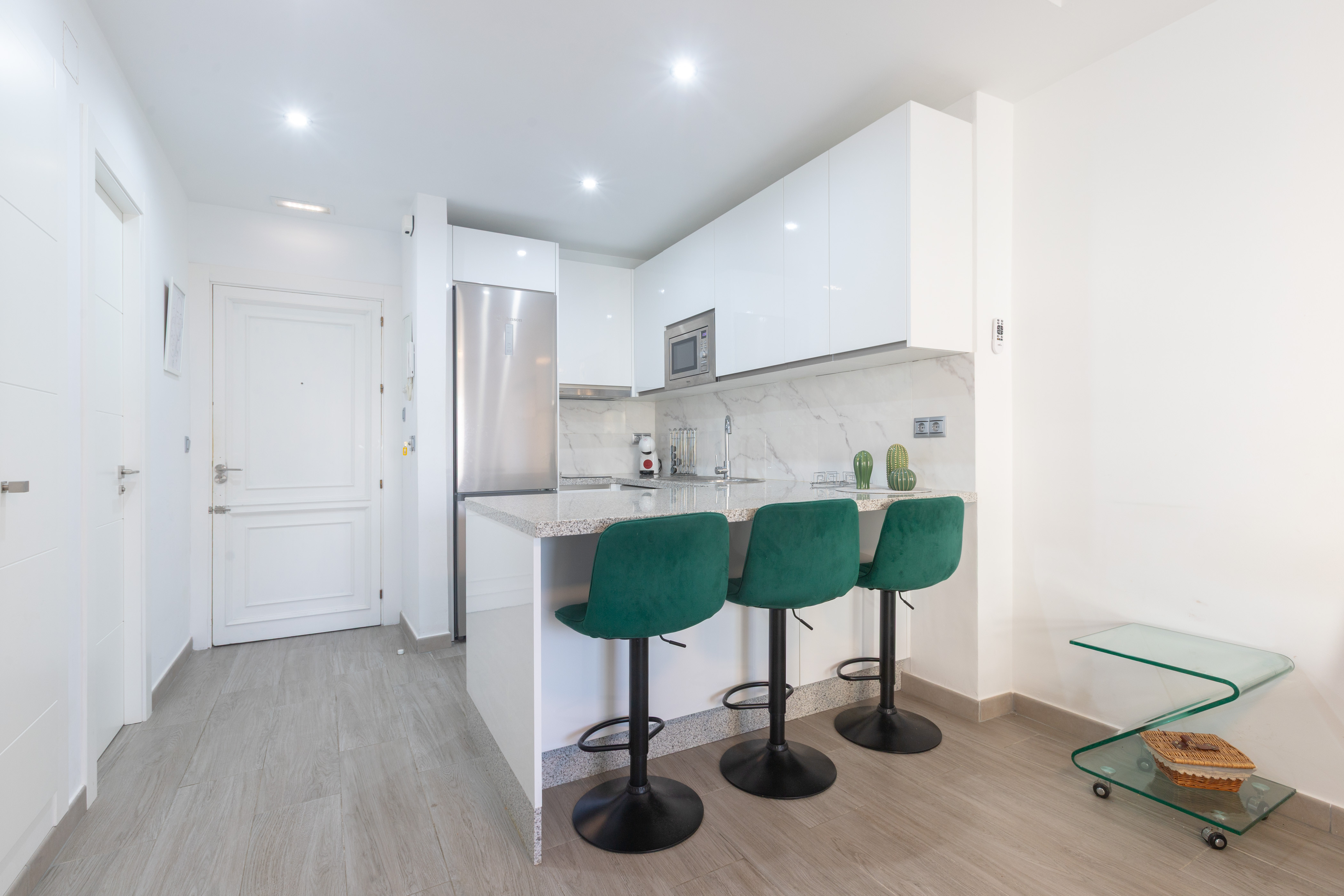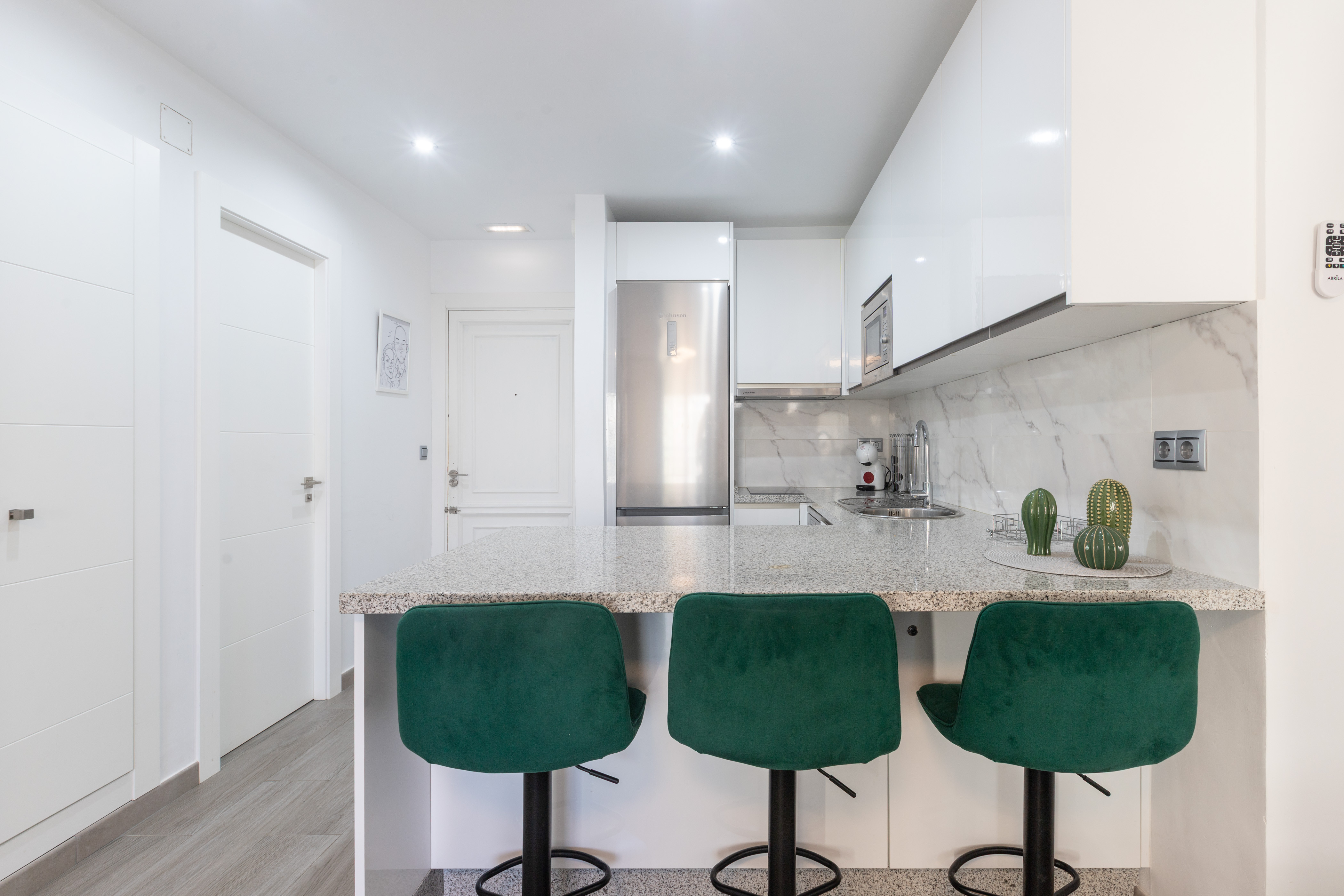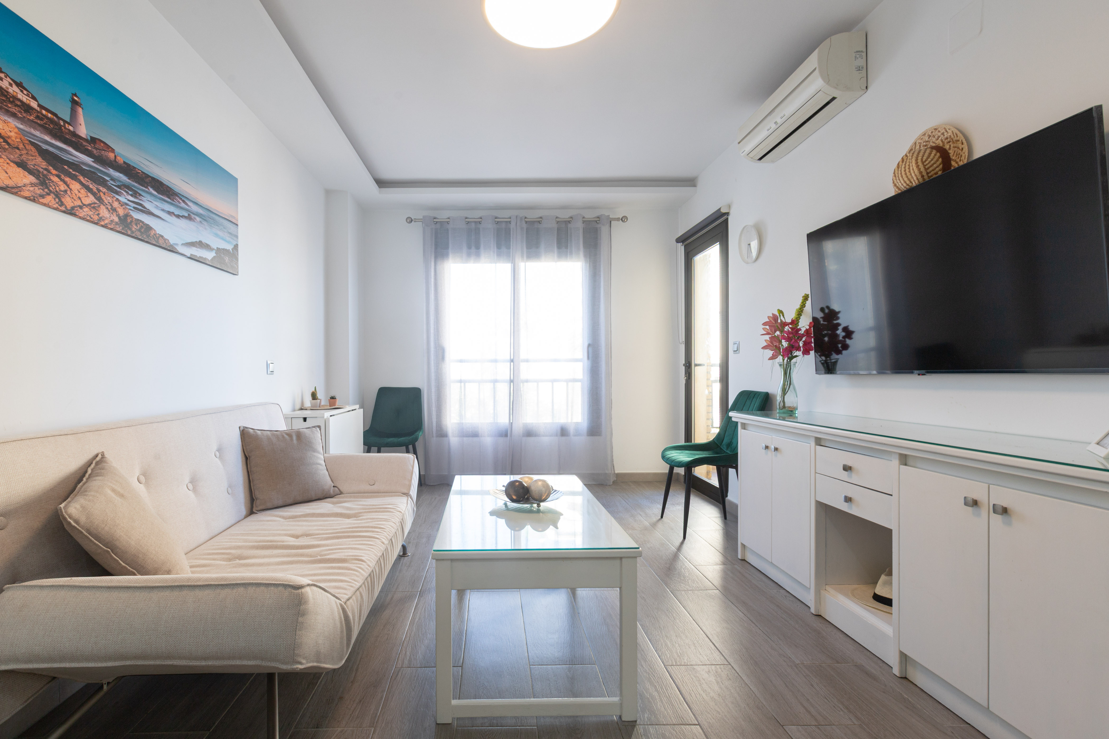 Het appartement bevindt zich op de eerste verdieping en is bereikbaar met een lift. Het heeft een privébalkon met zeezicht, uitgerust met een tafel en twee stoelen - perfect om buiten van het ontbijt te genieten. Binnen vindt u een open ruimte die de keuken verbindt met de eetkamer en de woonkamer, voorzien van airconditioning en een Smart TV. De keuken met keramische kookplaat is volledig uitgerust met alle benodigde keukengerei, zodat u comfortabel kunt koken en zich thuis voelt.