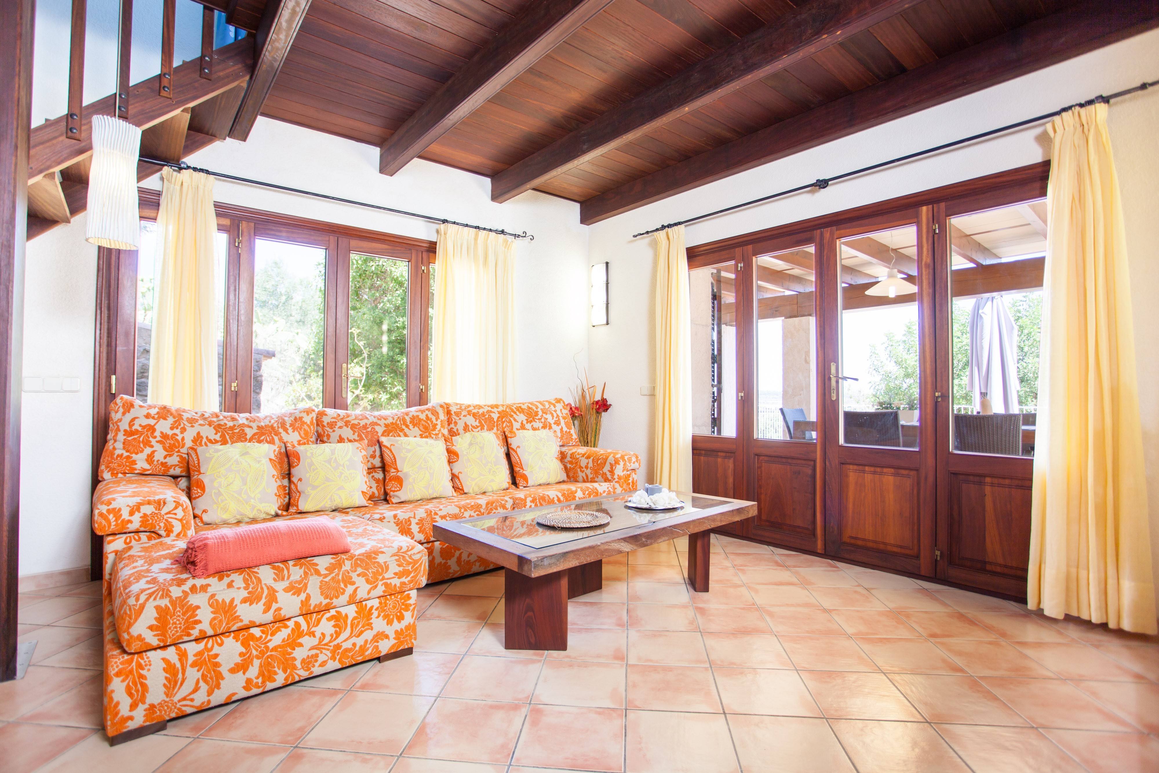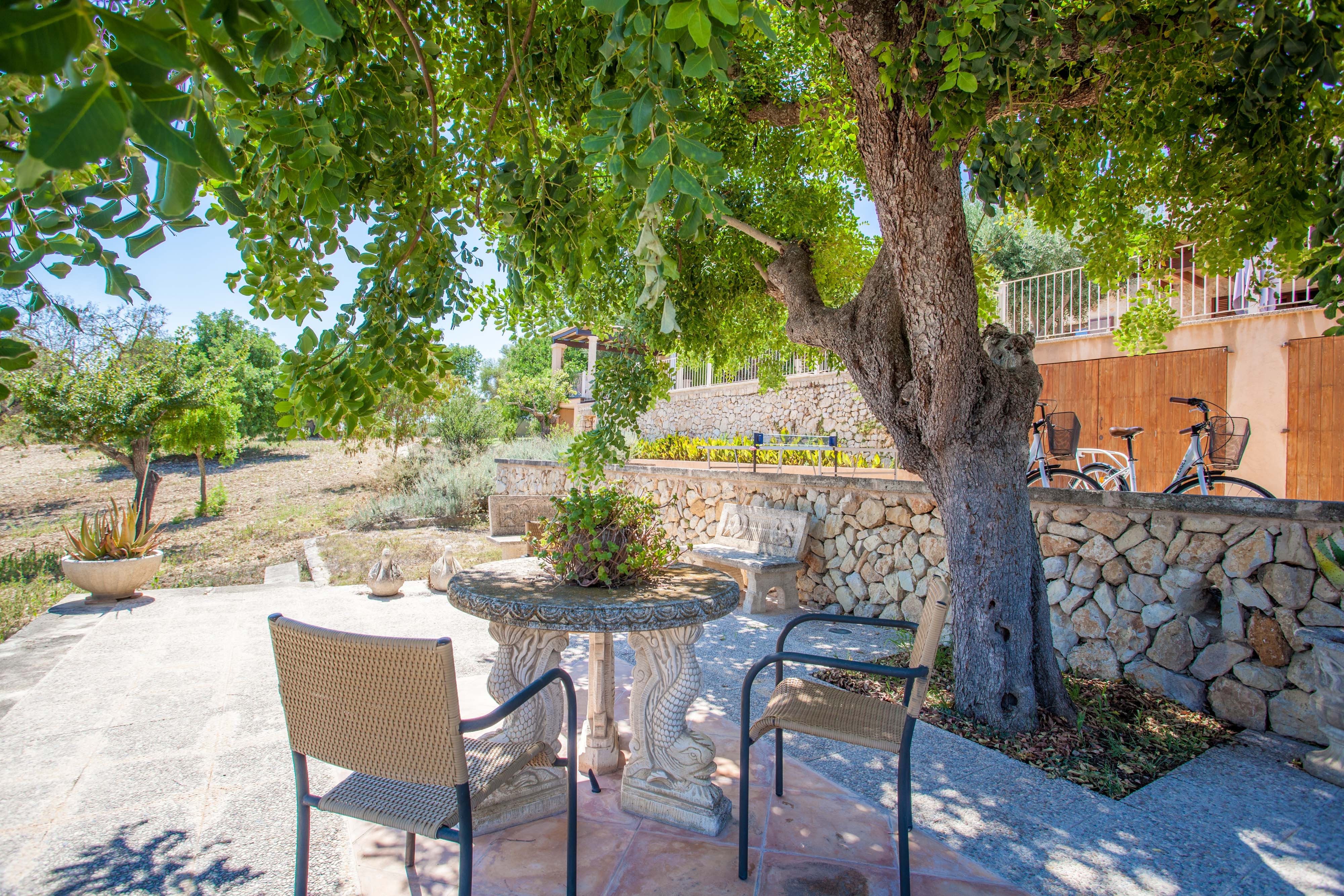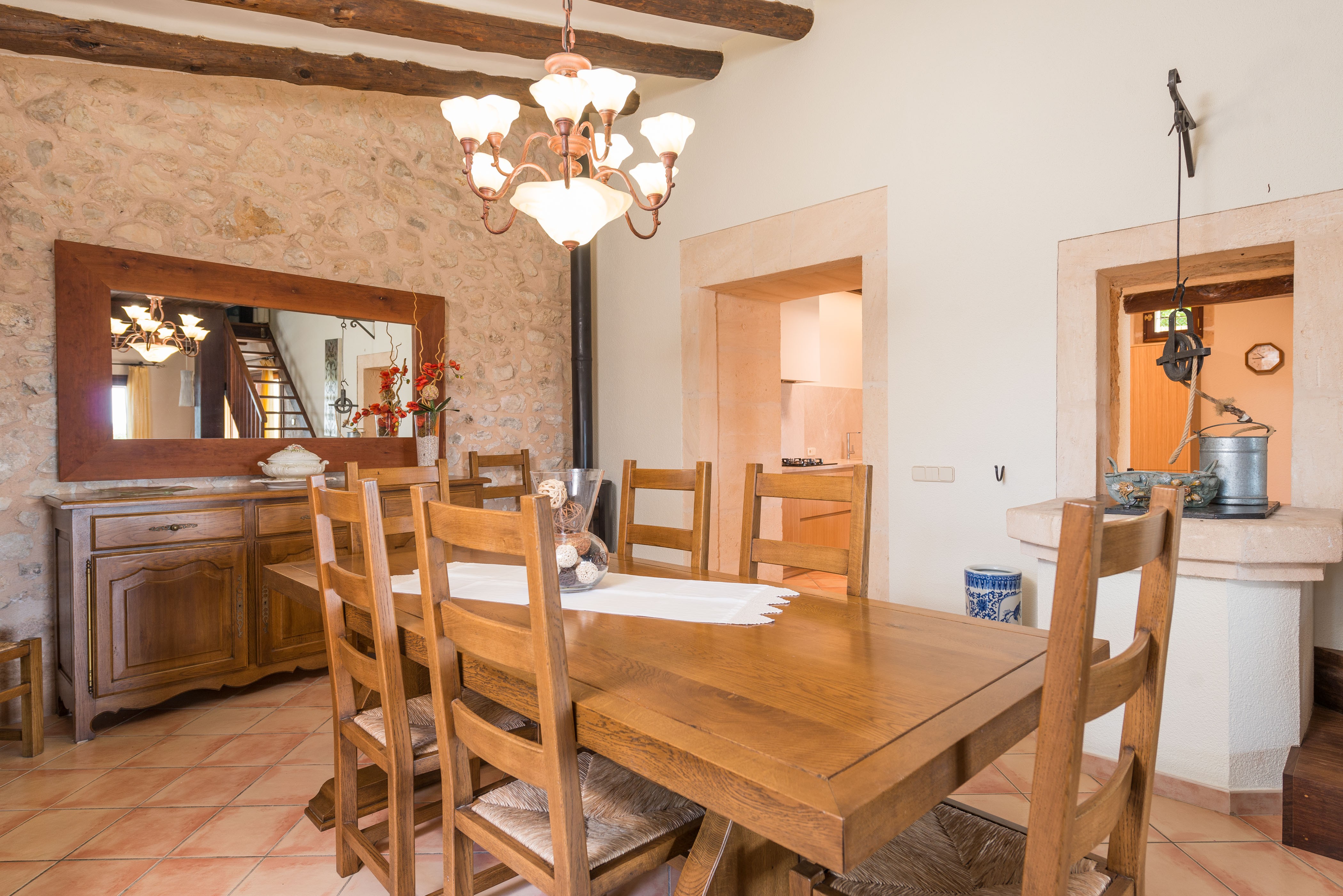 Dit prachtige huis heeft een traditionele Mallorcaanse stijl. Het heeft twee verdiepingen die worden gekenmerkt door ruime en lichte kamers met een rustieke maar moderne stijl en met alle comfort om ten volle van uw vakantie te genieten. Op de begane grond vindt u een fantastische eetkamer voor 6 personen met ongelooflijke details, zoals het interieur. Het deelt de ruimte met de woonkamer die uitkomt op de buitenveranda. Hier kunt u uitrusten op de comfortabele bank terwijl u satelliettelevisie kijkt of op de koudste nachten geniet van de warmte van de open haard. Via het eetgedeelte vindt u de toegang tot de keuken. Het beschikt over een gaskookplaat en is goed uitgerust om tijdens uw verblijf te koken. Het beschikt over een vaatwasser, een elektrische oven en een tafel met een stoel voor het ochtendontbijt. Het huis beschikt ook over een onafhankelijke wasruimte met een wasmachine, een strijkijzer en een strijkplank. In het huis vindt u 3 slaapkamers om uit te rusten. Twee ervan bevinden zich op de begane grond, één met een tweepersoonsbed en de andere met twee eenpersoonsbedden. Er is ook een badkamer met douche op deze verdieping. De laatste slaapkamer bevindt zich op de eerste verdieping. Het heeft een tweepersoonsbed, airconditioning en een eigen badkamer met douche. Als u met een baby reist, kunnen wij een kinderbedje en een kinderstoel klaarmaken.