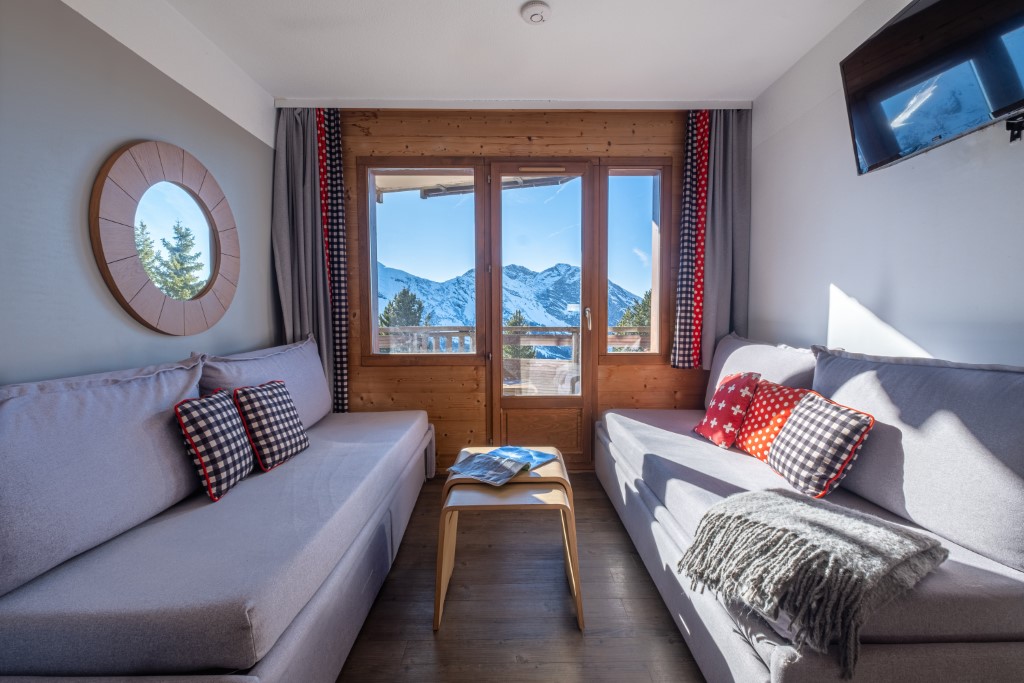 Woonkamer met 2 slaapbanken voor 1 persoon 1 slaaphoek met stapelbed in de hal.