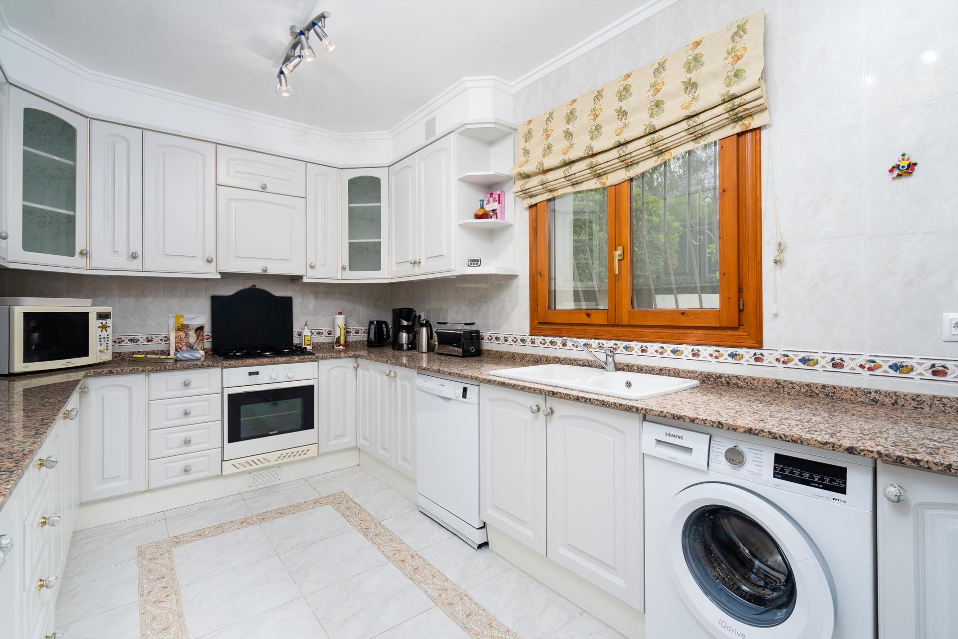 - keuken met gasfornuis, electrische oven, magnetron, afwasmachine, koel-vriescombinatie, koffiezetapparaat, waterkoker, mixer, broodrooster en citruspers