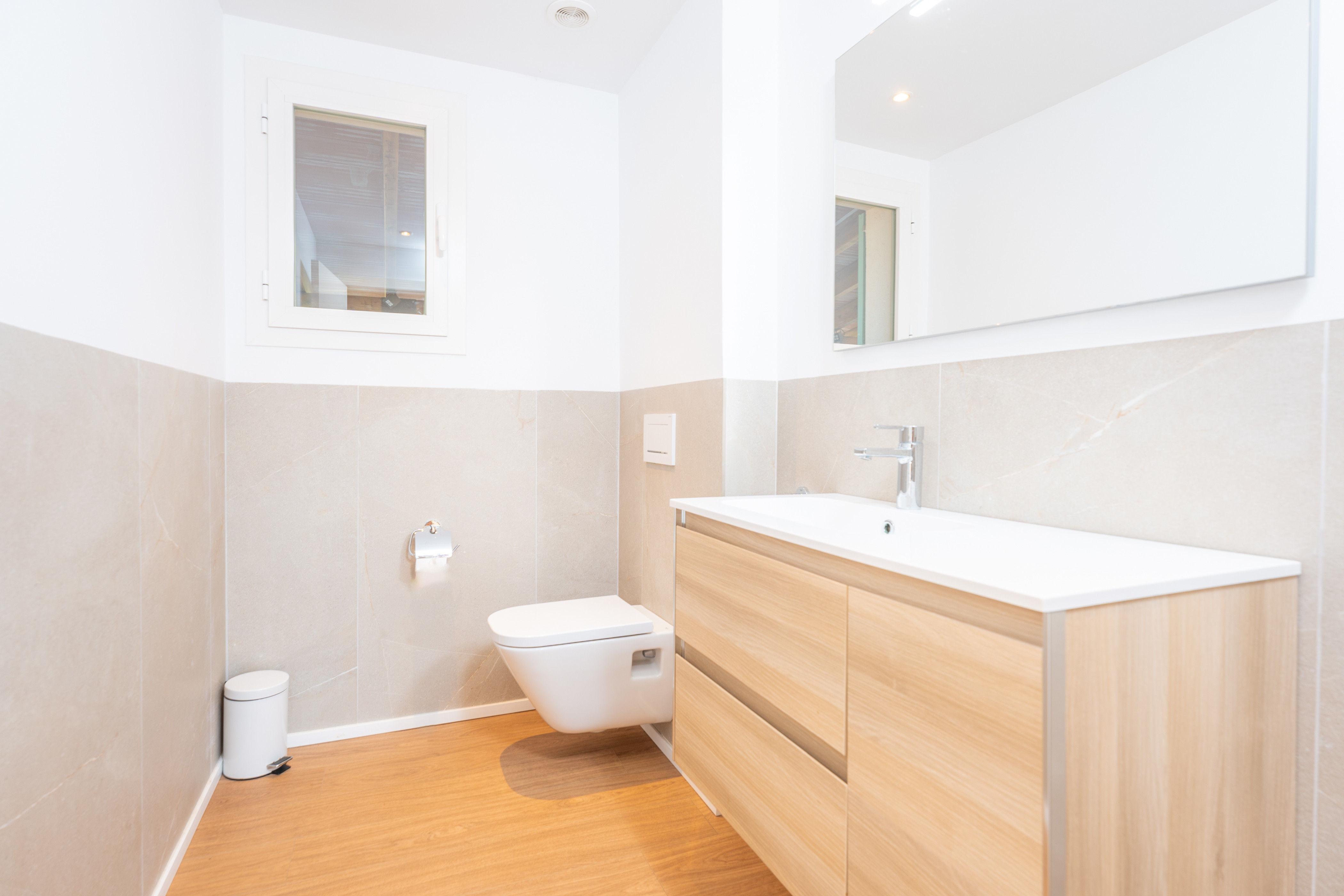 De begane grond omvat ook een gastentoilet en de eerste slaapkamer, uitgerust met twee eenpersoonsbedden, airconditioning en een en-suite badkamer met douche.
