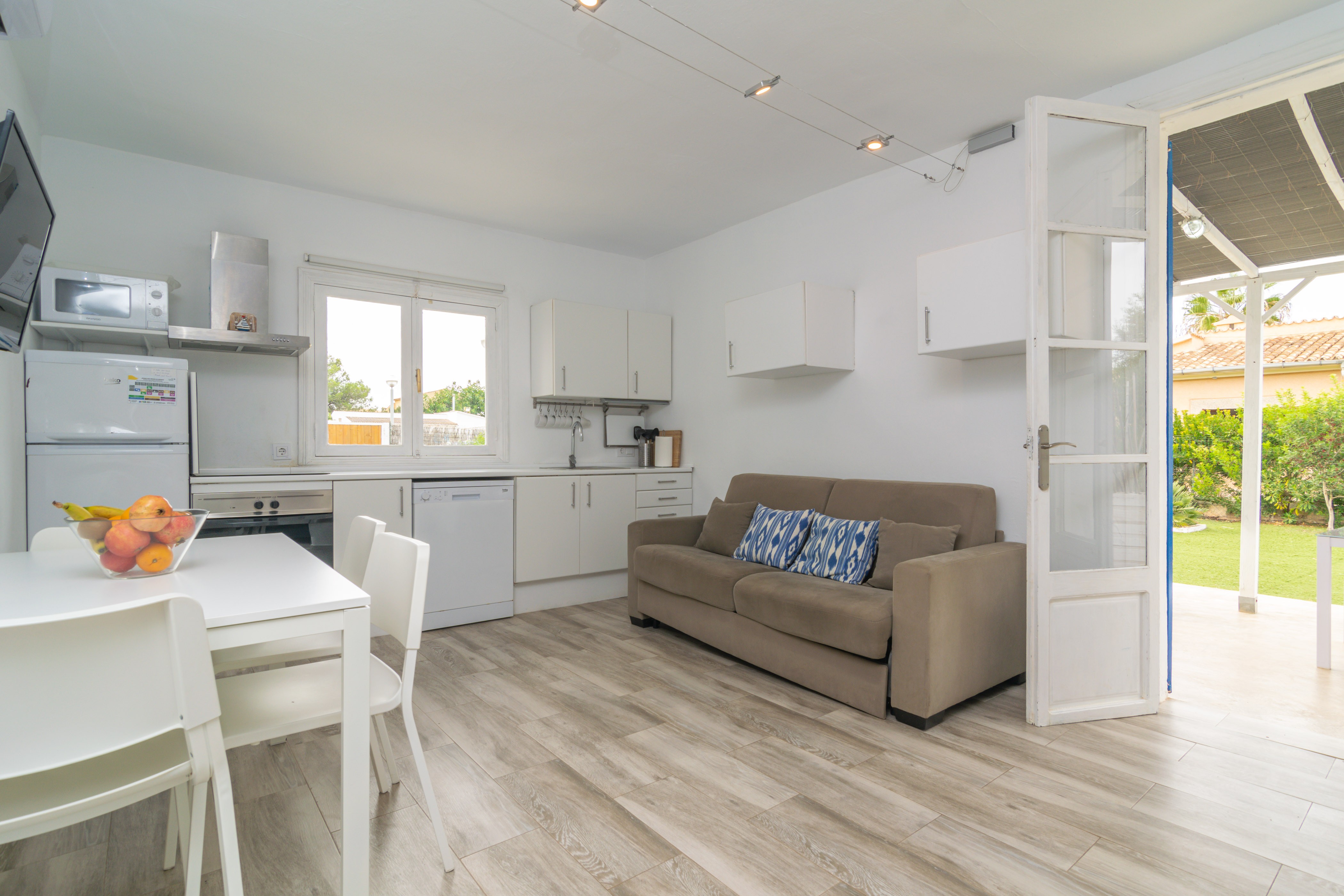 We stappen de woon- en eetkeuken binnen, die is voorzien van een slaapbank en een eettafel. Er is satelliet-tv, wifi en airconditioning. De kitchenette werkt met een vitrokookplaat en beschikt over een elektrische oven en al het benodigde keukengerei om tijdens uw verblijf uw favoriete gerechten te bereiden, evenals een wasmachine, een strijkijzer en een strijkplank. Er is slechts één slaapkamer met een tweepersoonsbed. Op verzoek kunnen wij een babybedje en een kinderstoel klaarmaken. Er is een badkamer met een douche.