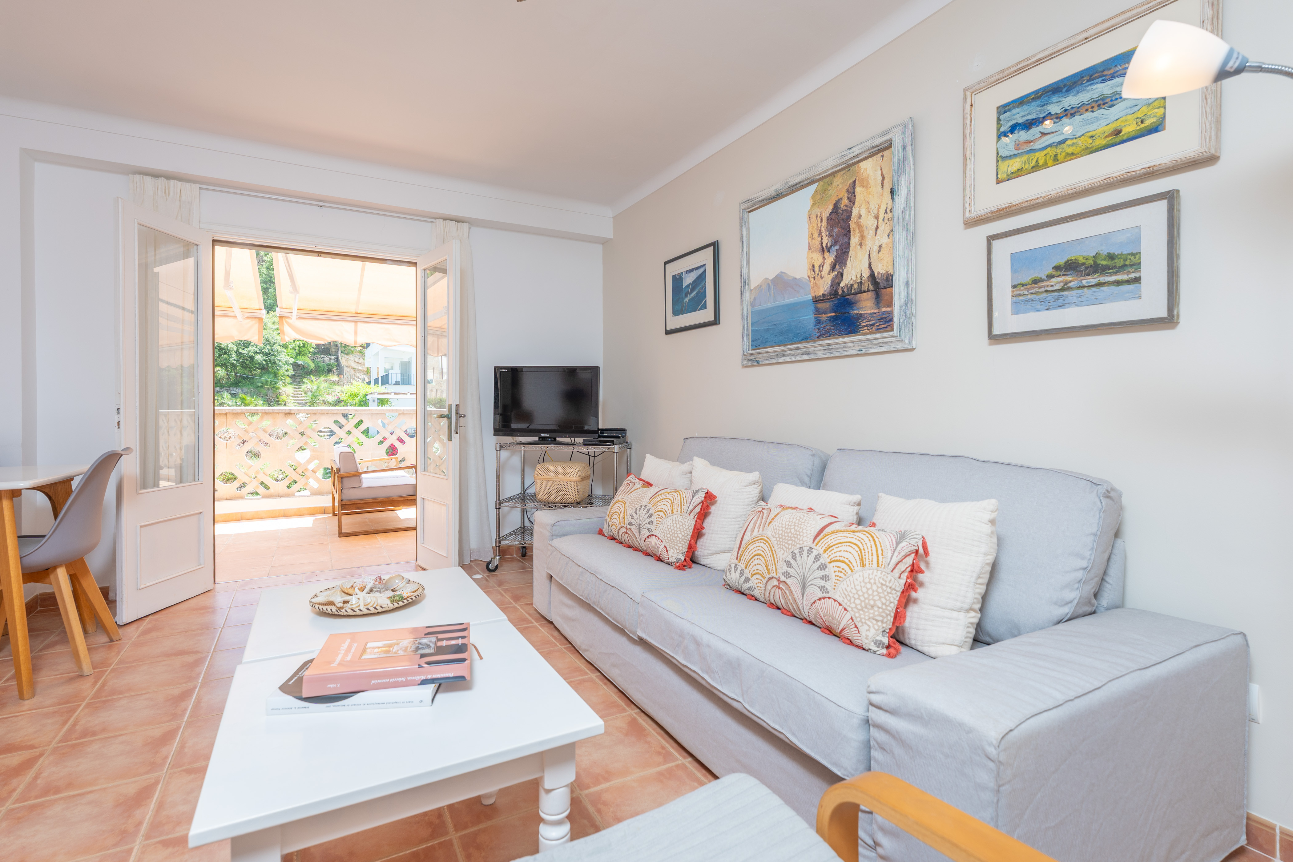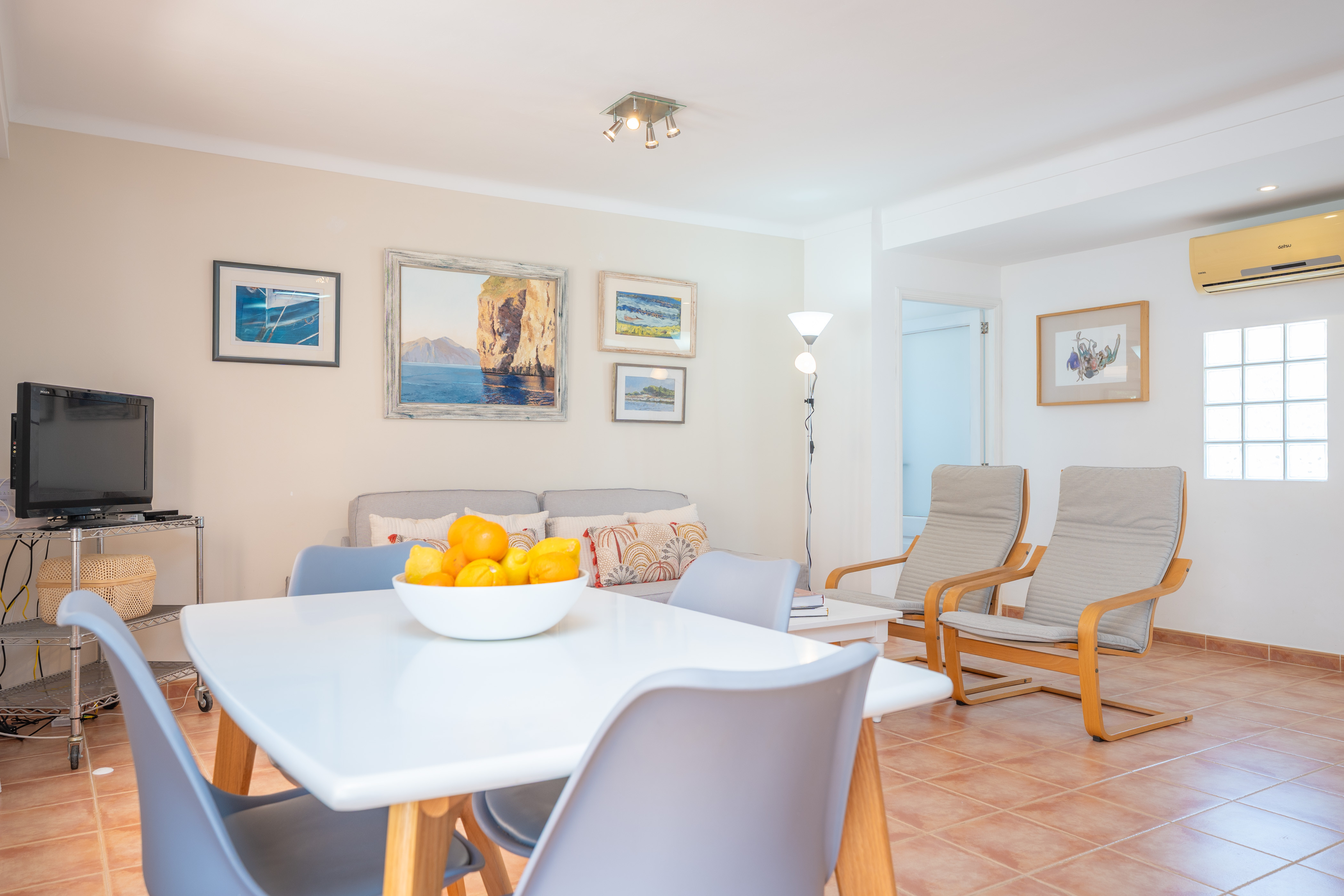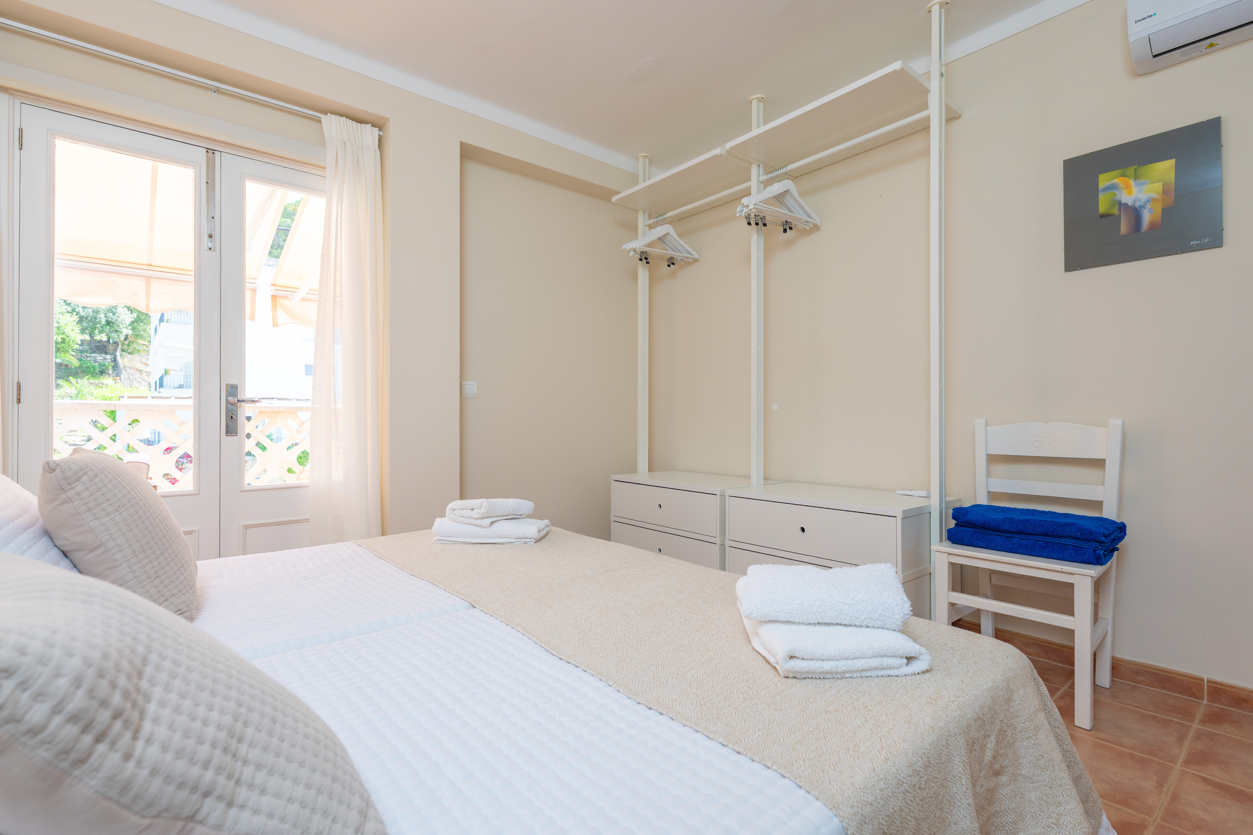 Binnen verrast deze eerste verdieping, zonder lift, met een open plan dat de keuken combineert met de woonkamer en eetkamer. Je zult zeker genieten van het bereiden van je beste recepten op de keramische kookplaat, samen eten of dineren en ontspannen op de bank met een goede film op de satelliettelevisie. Er is airconditioning in deze kamer en in de twee slaapkamers van het huis. Beide slaapkamers hebben twee eenpersoonsbedden en een van hen heeft een en-suite badkamer met een douche. Beide slaapkamers hebben een kledingkast, ruimte voor een kinderbedje en kinderstoel, en een terras. Er is een tweede badkamer met een bad voor het hele huis. Tot slot is er een wasruimte met een wasmachine, strijkijzer en strijkplank.