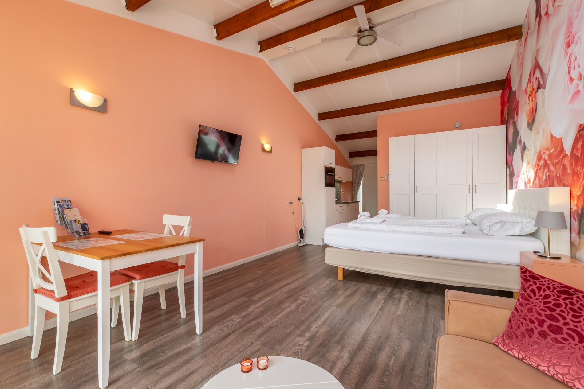 De studio is praktisch ingedeeld en biedt alles wat je nodig hebt op de begane grond. Aan de achterzijde van de studio vindt u een gezellig woongedeelte met een bank, salontafel en televisie en uitzicht op de privétuin.