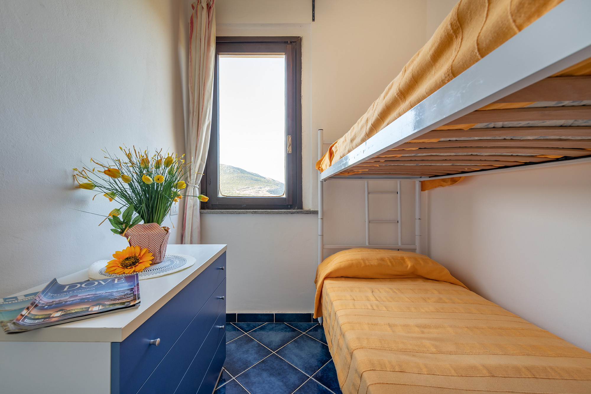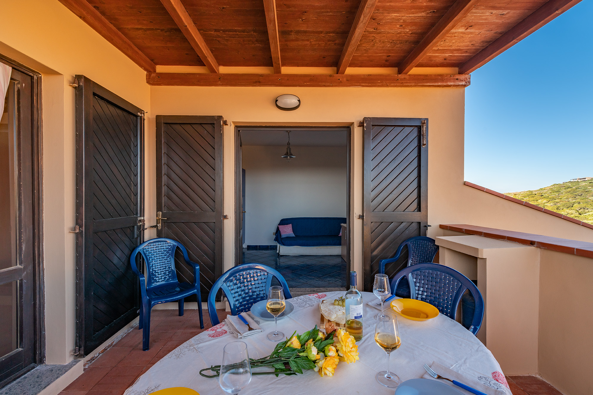 Gelegen op de eerste verdieping en bereikbaar via een wenteltrap, bestaat het interieur uit een gezellige woonkamer met een kitchenette en een slaapbank, een hoofdslaapkamer met een tweepersoonsbed, een tweede slaapkamer met stapelbedden en een badkamer. Het appartement beschikt ook over een groot overdekt terras met een tafel en stoelen, met een prachtig uitzicht op de zee en het eiland Asinara. Andere faciliteiten zijn een tv, wasmachine, vaatwasser en oven. Er is ook een gereserveerde parkeerplaats beschikbaar.