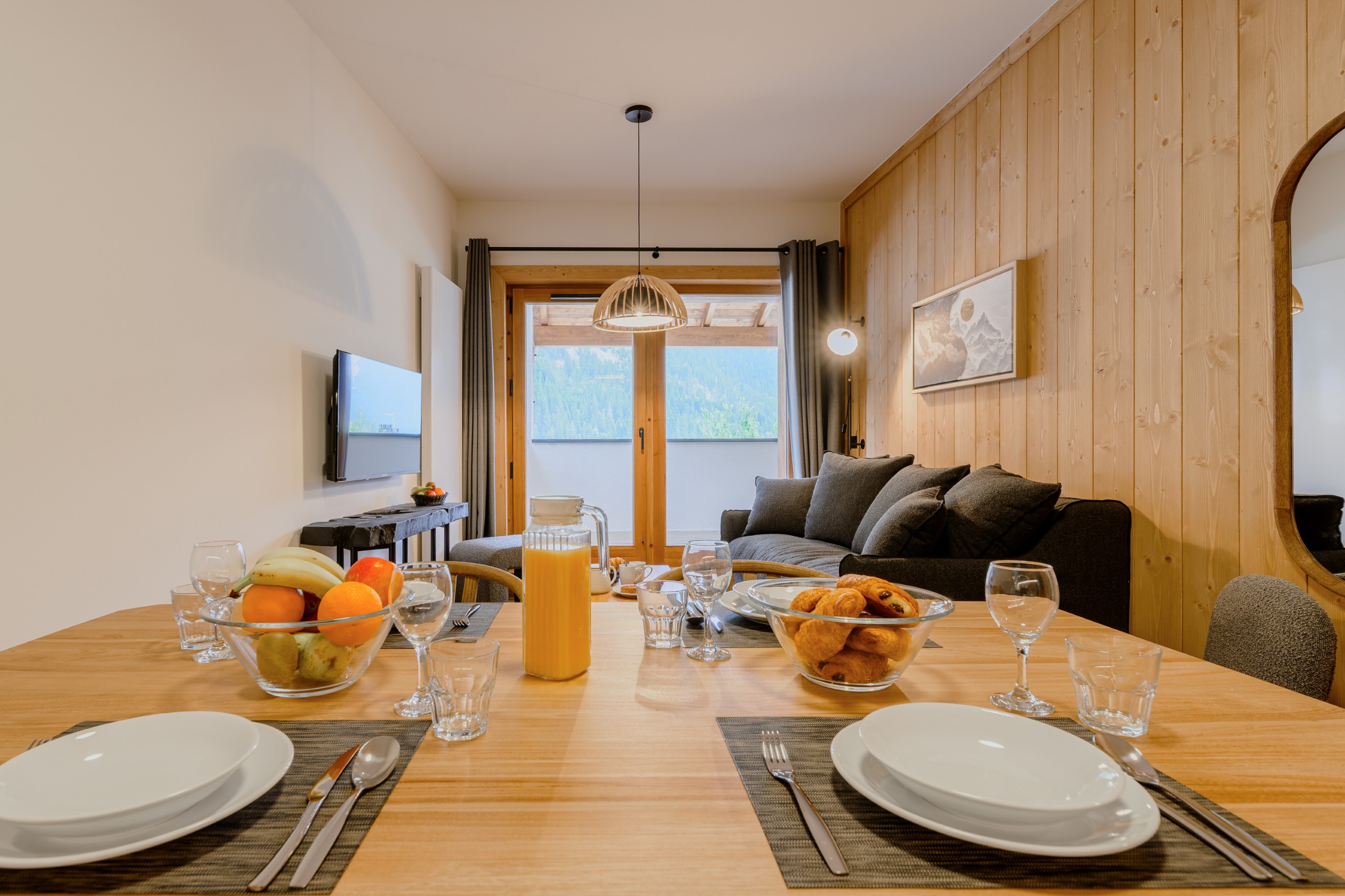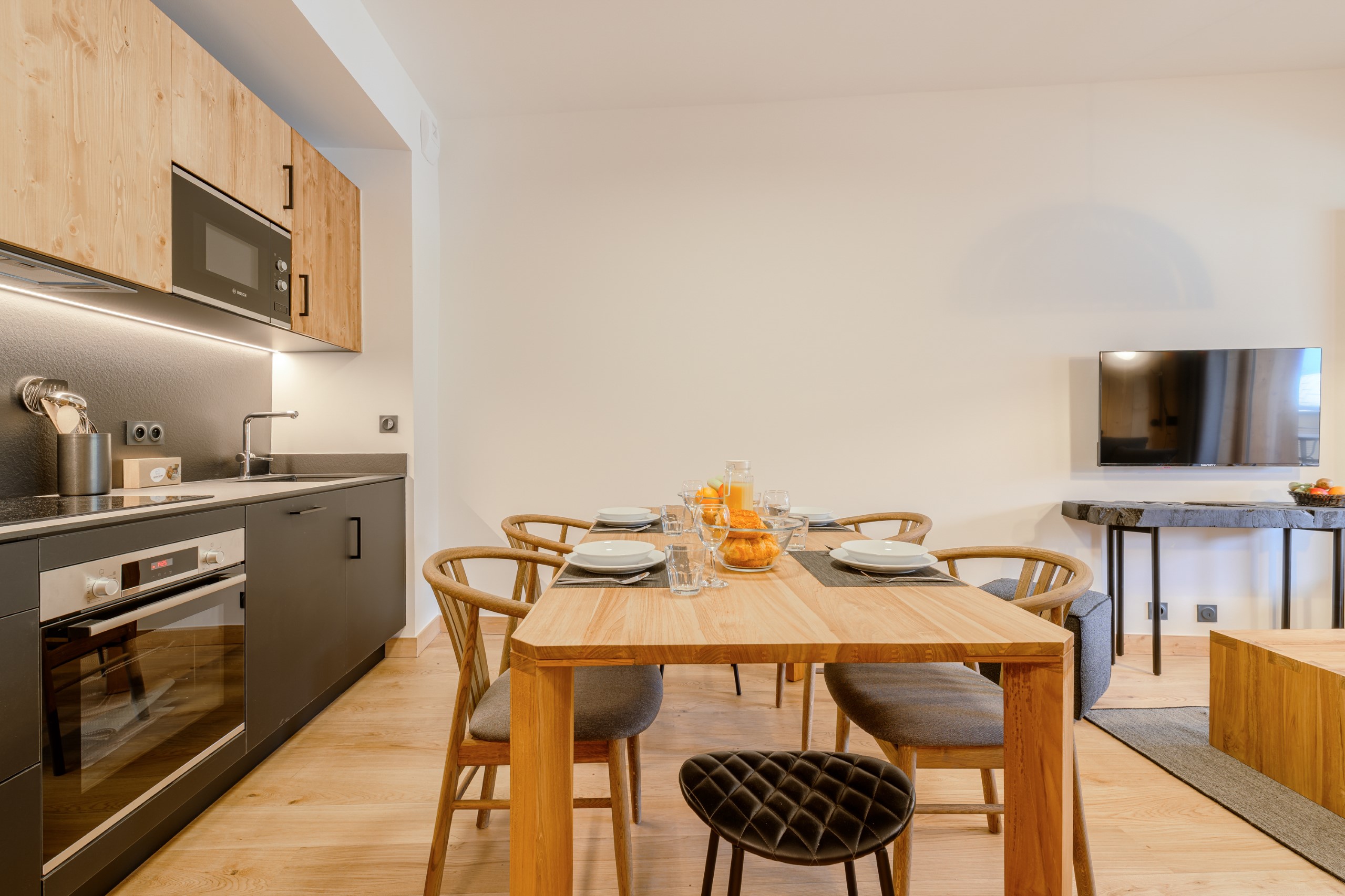 Alle appartementen zijn uitgerust met een woonkamer met een slaapbank (met uitzondering van studio's). Elk appartement heeft een flatscreen-tv met digitale televisie en een open keuken die volledig is uitgerust met een keramische kookplaat, oven, magnetron, vaatwasser, koelkast, koffiezetapparaat, broodrooster en waterkoker. U vindt er ook een complete set serviesgoed en bestek.