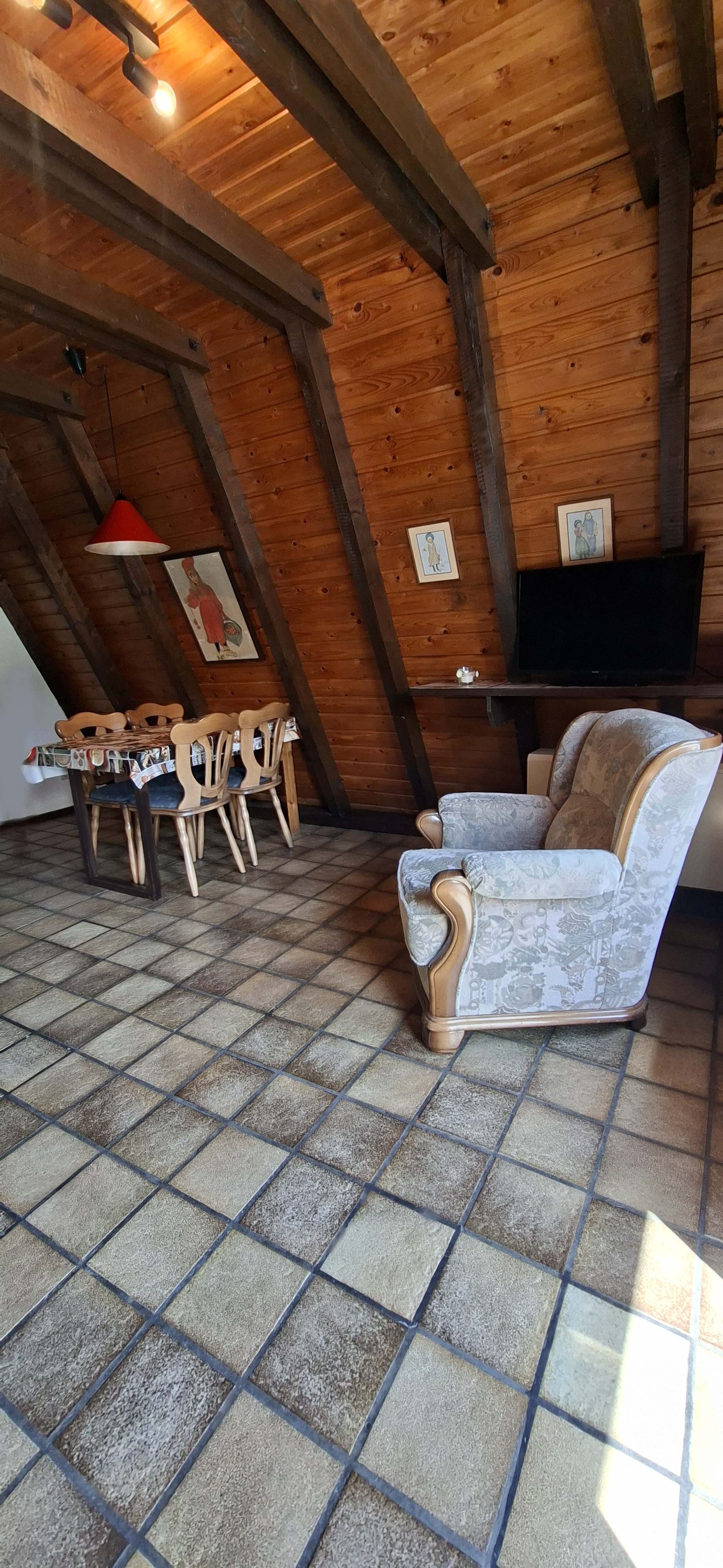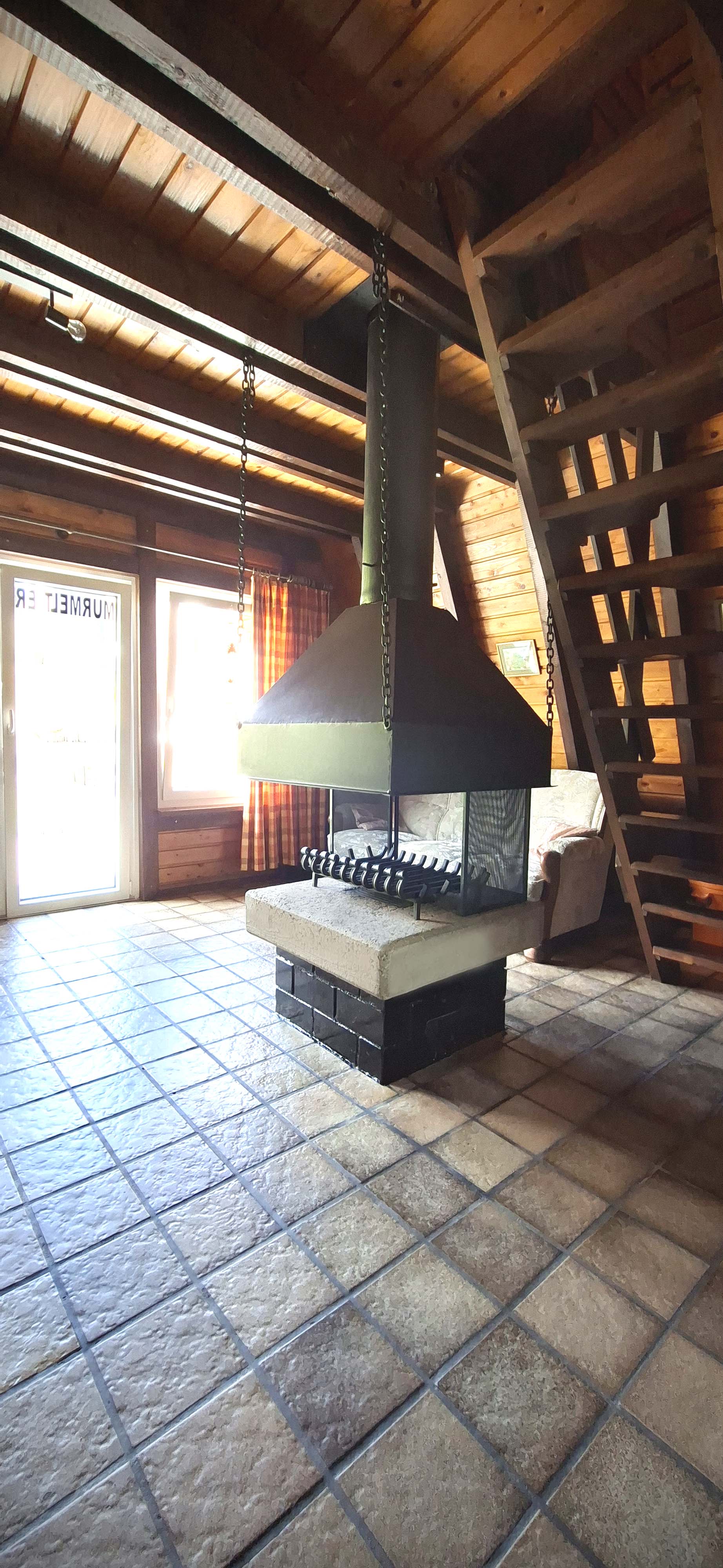 De begane grond beschikt over een gezellige woonkamer met een open haard, een zithoek, een eethoek, een compacte kitchenette en een badkamer met douche, wastafel en toilet. Een kleine hal verbindt de ruimtes, en de woonkamer biedt directe toegang tot een privéterras.