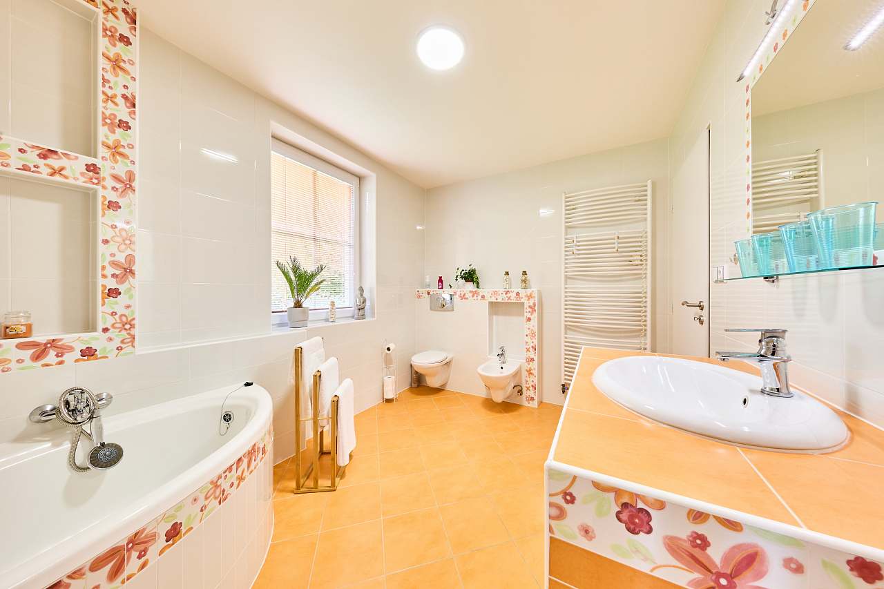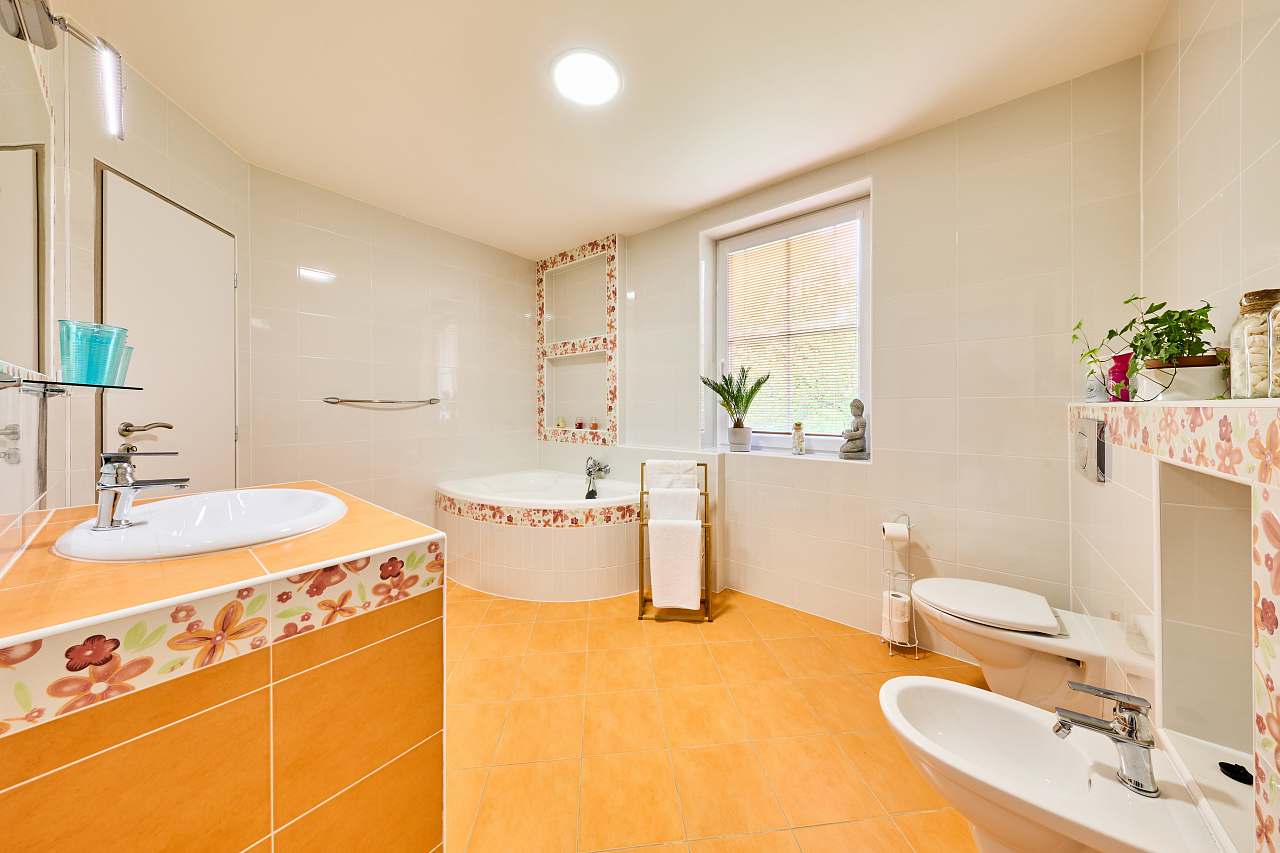 Op de begane grond in de hal bevindt zich een separaat toilet en een ruime badkamer met toilet, bidet en ligbad.
