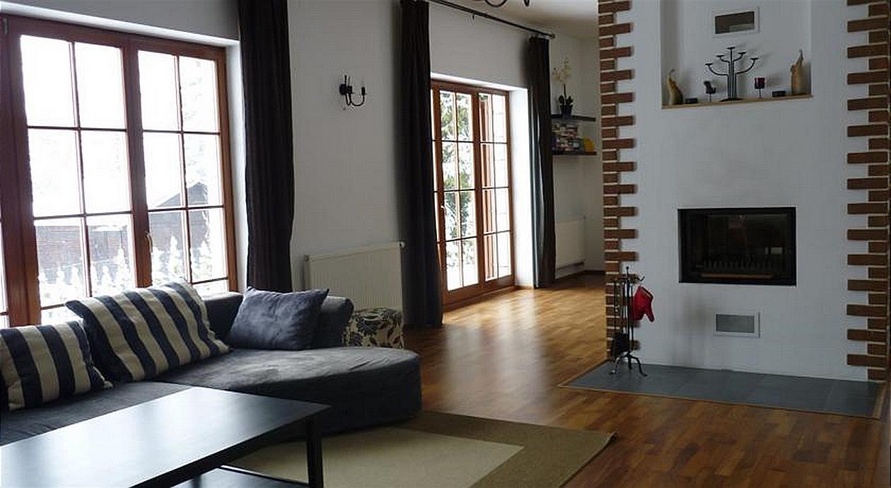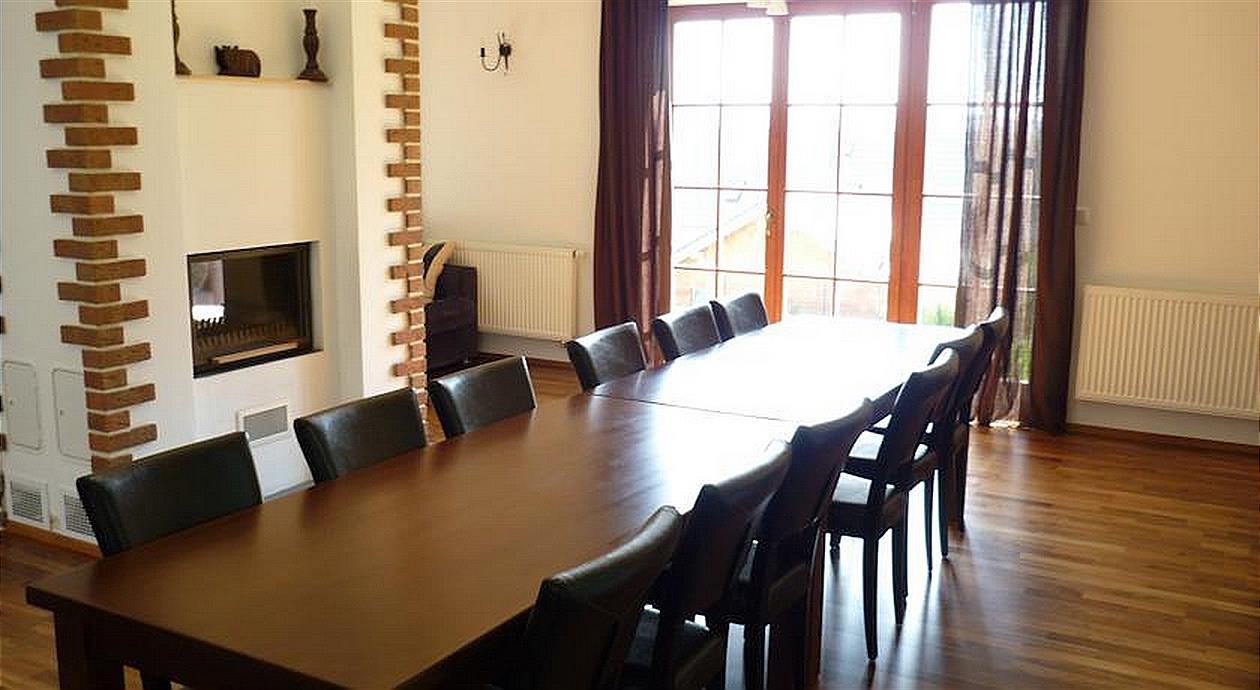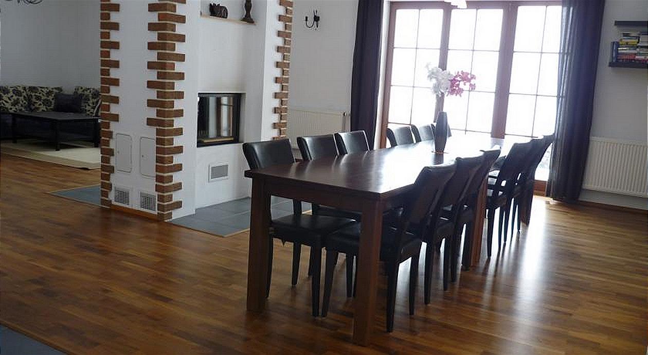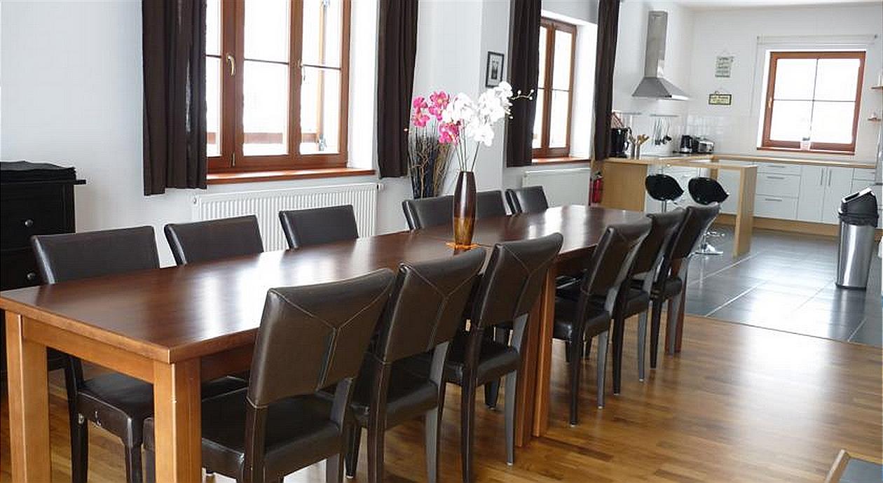 De luxe en modern ingerichte villa met ruime entree, heeft in totaal 9 kamers, waarvan 7 slaapkamers, 2 keukens, 3 badkamers, 4 aparte toiletten, een woonkamer van 60 m2, een zitkamer van 30 m2, wasruimte, patio en veranda. In de hal zijn de afsluitbare "voordeuren" naar zowel het grote woongedeelte als het appartementsgedeelte. In de wooneetkamer van het grote woongedeelte zijn een comfortabele zithoek, satelliet-TV (plasma/LCD) met DVD-speler, een stereo-installatie met CD-speler en een bijzondere openhaard tussen het woon- en eetgedeelte, waar je aan weerskanten omheen kunt lopen. De open keuken met bar en barkrukken is uiterst compleet ingericht met broodrooster, elektrisch fornuis met 4 kookplaten en oven, magnetron, afzuigkap, koffiekan, koffiezetapparaat, espresso koffiemachine, elektrische waterkoker, vaatwasser, koelkast, vriezer en ijsblokjesmachine. Beneden is een apart toilet. Op de verdieping zijn een hal, 3 slaapkamers met elk twee 1-persoonsbedden, en 3 slaapkamers met elk een 2-persoonsbed, waarvan een kamer tevens beschikt over een fors balkon van 17 m2 en een eigen badkamer met ligbad, douche en wastafel. In 5 slaapkamers is een inloopkast. Op de verdieping is nog een extra badkamer met dubbele wastafel, en ligbad. Naast de badkamer is een apart toilet. Om het gevoel van comfort echt af te maken, is er bovendien nog een sauna waarvoor u tegen een redelijke prijs credits kunt kopen. Het appartement op de begane grond bestaat uit een wooneetkeuken met een 2-persoons slaapbank, eethoek, satelliet-TV (plasma/LCD) met DVD-speler. De open keuken is ingericht met een keramische kookplaat, oven, magnetron, afwasmachine en koel-/vriescombinatie. Dan is er een slaapkamer met een 2-persoonsbed en een stapelbed, een badkamer met ligbad, douche, wastafel en wasmachine en een apart toilet. Tot slot: ook aan kleine kinderen is gedacht: er zijn twee kinderbedden en een kinderstoel te huur. Ook is er een speelruimte met een keukentje, games, speelgoed en boeken. Het hele huis heeft centrale verwarming.