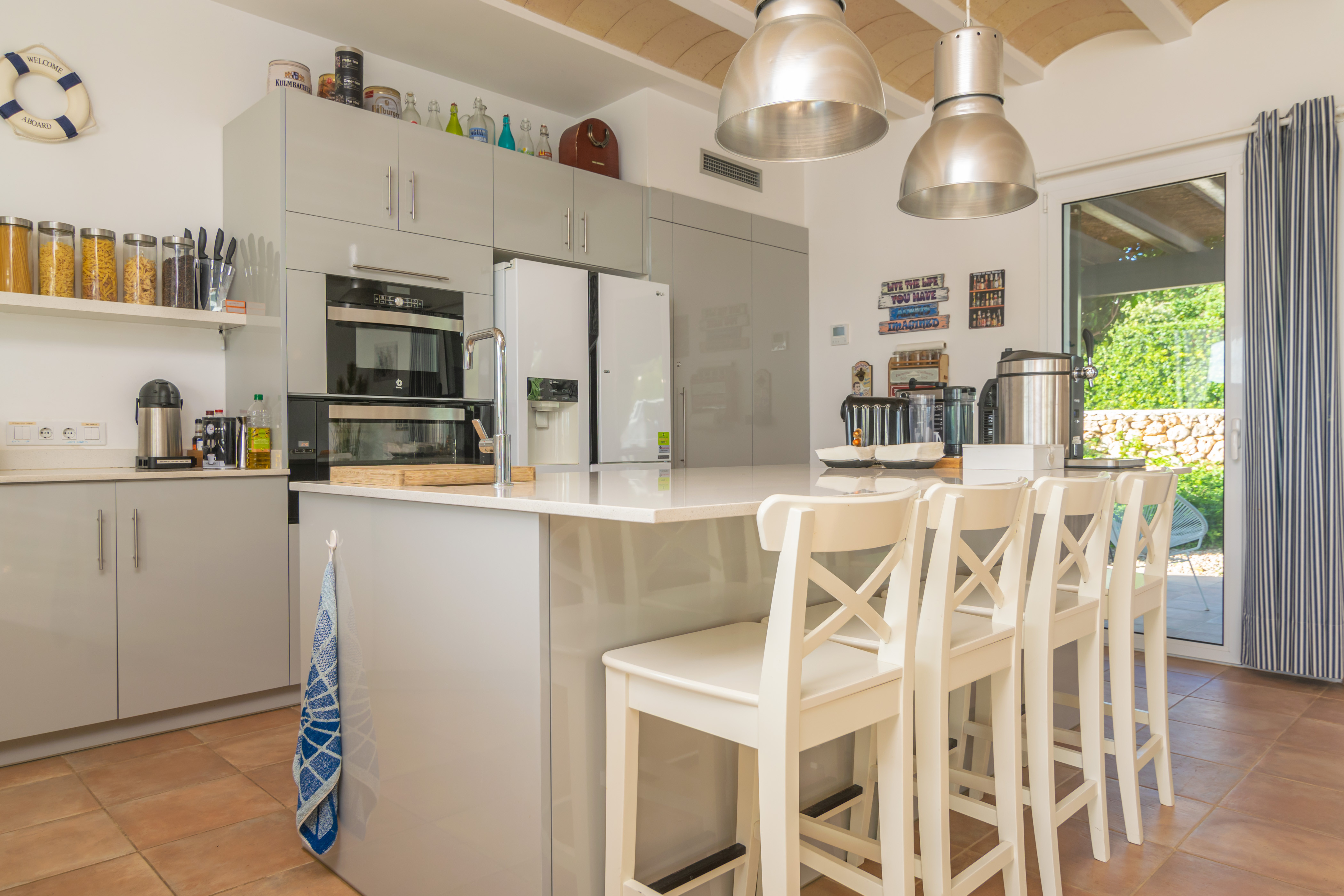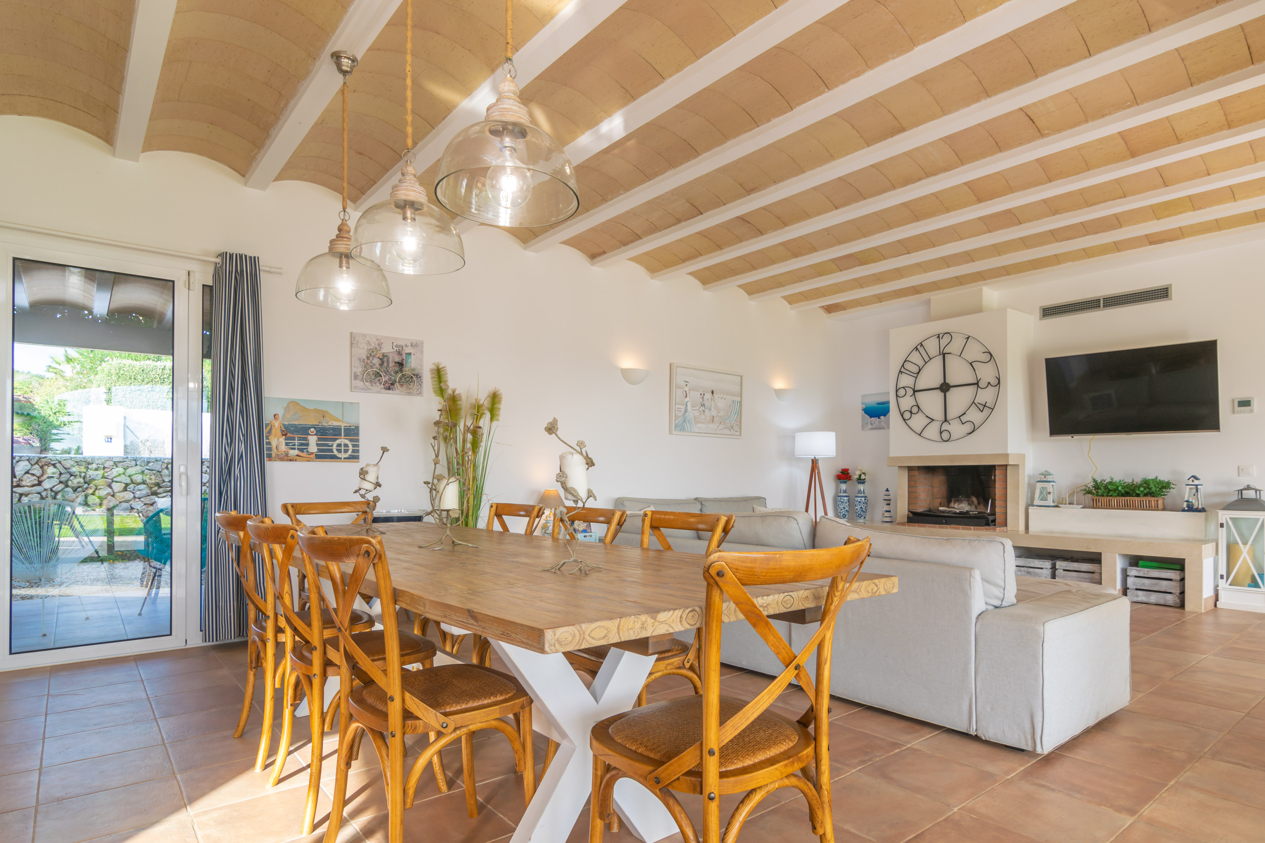 Het interieur van het huis, gelijkvloers en recent gebouwd, is ingericht in een moderne stijl. De grote woon-eetkamer, uitgerust met airconditioning, open haard en Smart TV, is perfect voor geweldige avonden. De keuken staat in open verbinding met de woonkamer en heeft alles wat je nodig hebt om heerlijke maaltijden te bereiden. In het huis is er een wasmachine, strijkijzer en strijkplank. Als het tijd is om uit te rusten, zijn er 4 slaapkamers met airconditioning en toegang tot de tuin. Drie ervan hebben een tweepersoonsbed en één heeft twee eenpersoonsbedden. Drie van hen hebben een badkamer met een eigen douche. Nog een badkamer met douche maakt het huis compleet. Als u met uw baby reist, kunnen wij u voorzien van een kinderbedje en een kinderstoel.