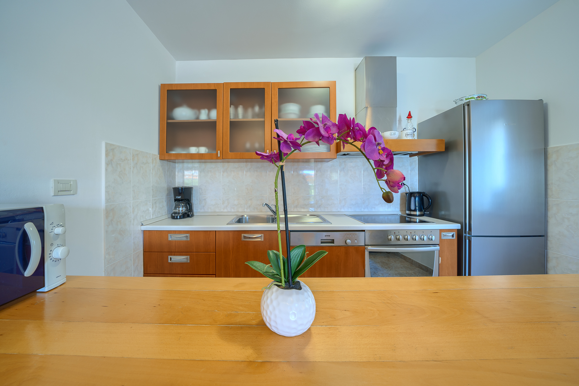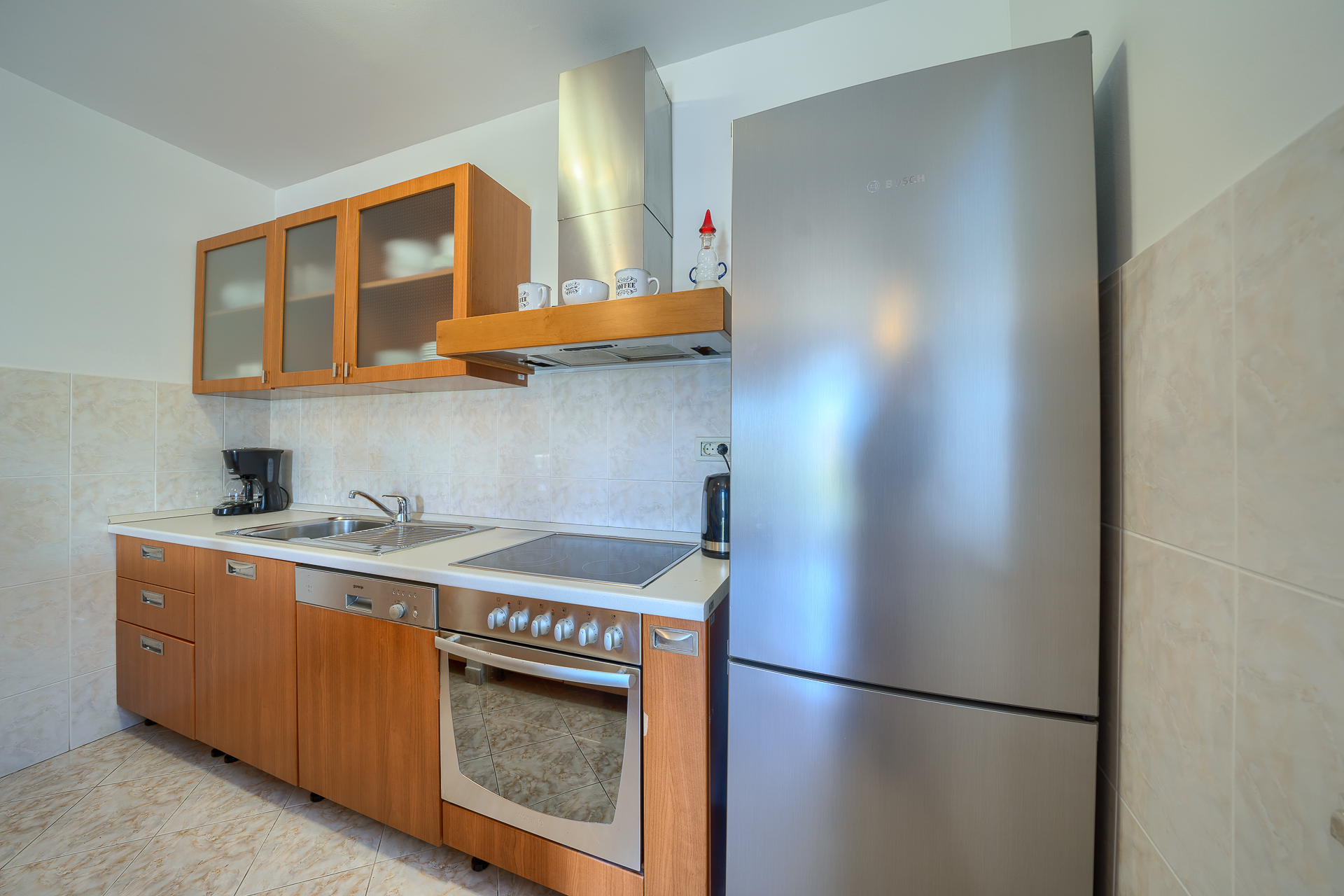 De volledig uitgeruste keuken beschikt over een vaatwasser, oven, elektrisch fornuis, koelkast, vriezer, magnetron, koffiezetapparaat, broodrooster, waterkoker en alle benodigde keukengerei. Er is een eetruimte, en een extra kitchenette zorgt voor extra gemak.