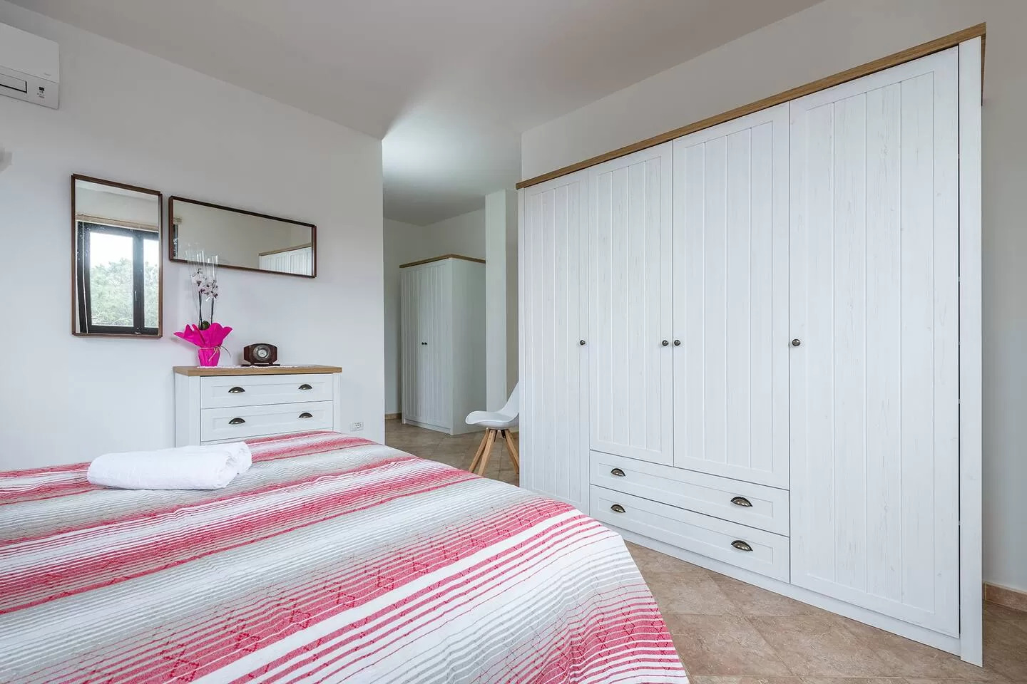 De woning is verdeeld over twee verdiepingen. Op de begane grond bevinden zich een eetgedeelte met een bank, een ruime keuken, een hoofdslaapkamer met een eigen badkamer, een tweede tweepersoonsslaapkamer, een derde slaapkamer met twee eenpersoonsbedden en een tweede badkamer. Via de trap bereikt men de vierde slaapkamer met een eigen badkamer.