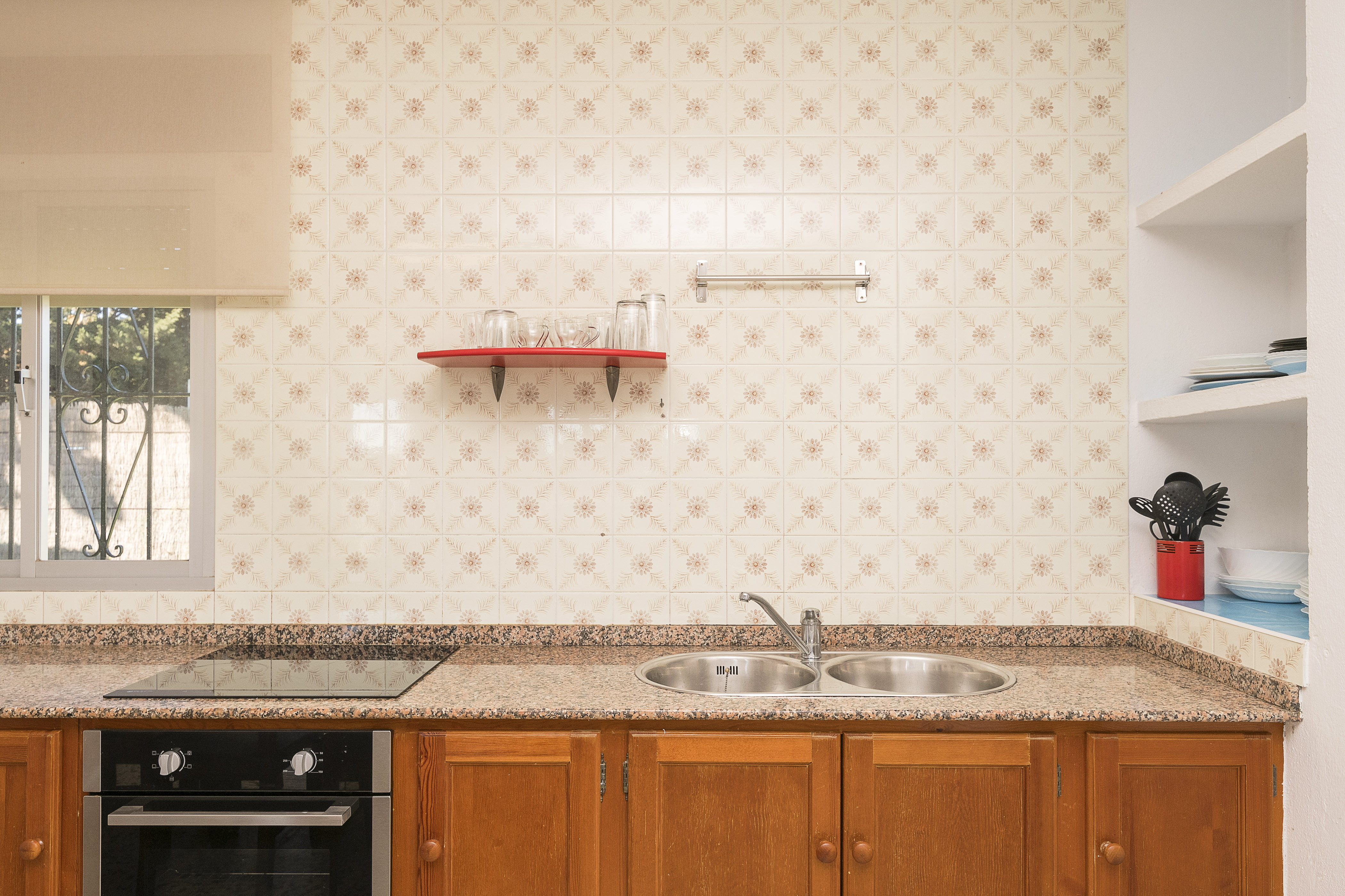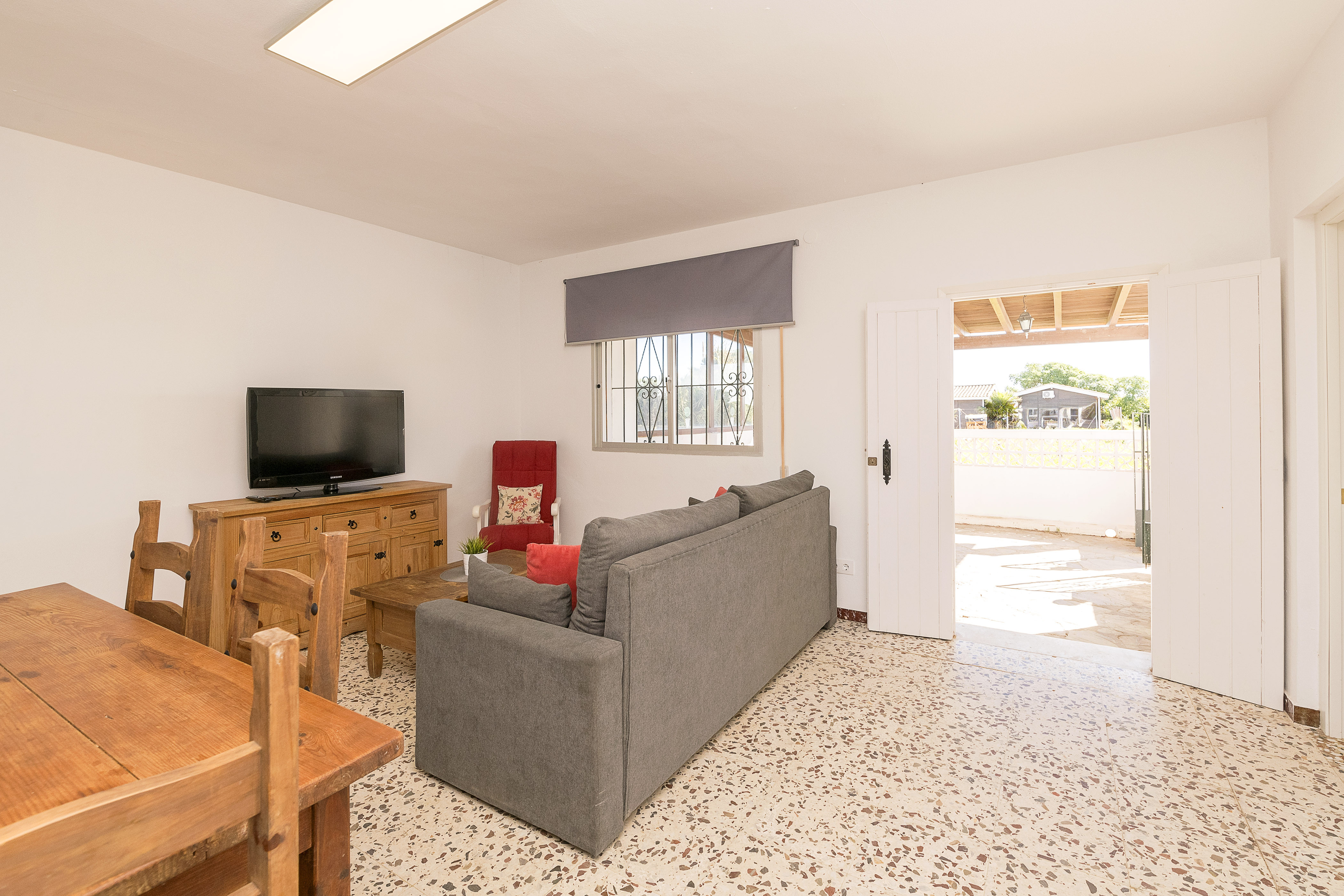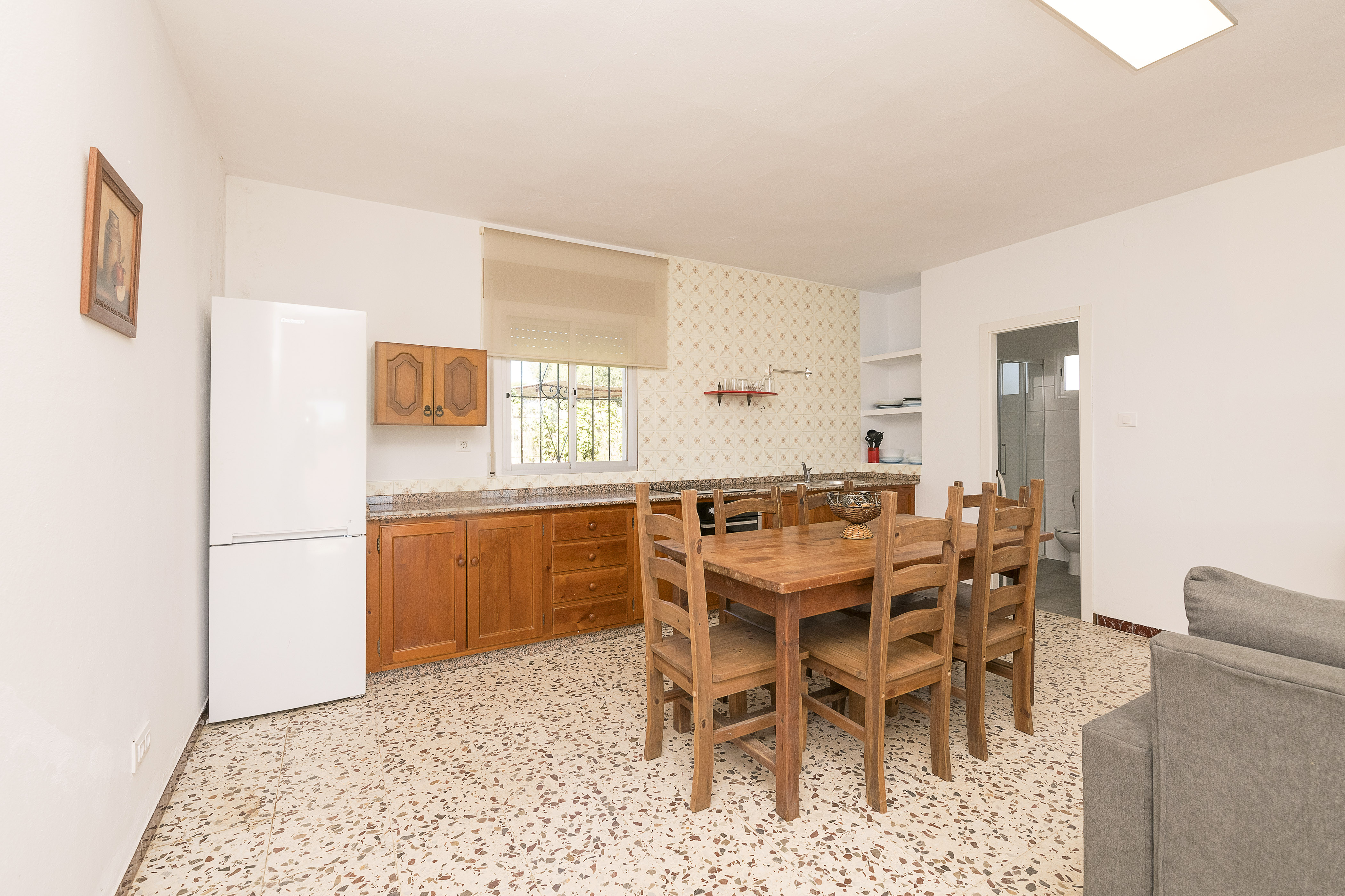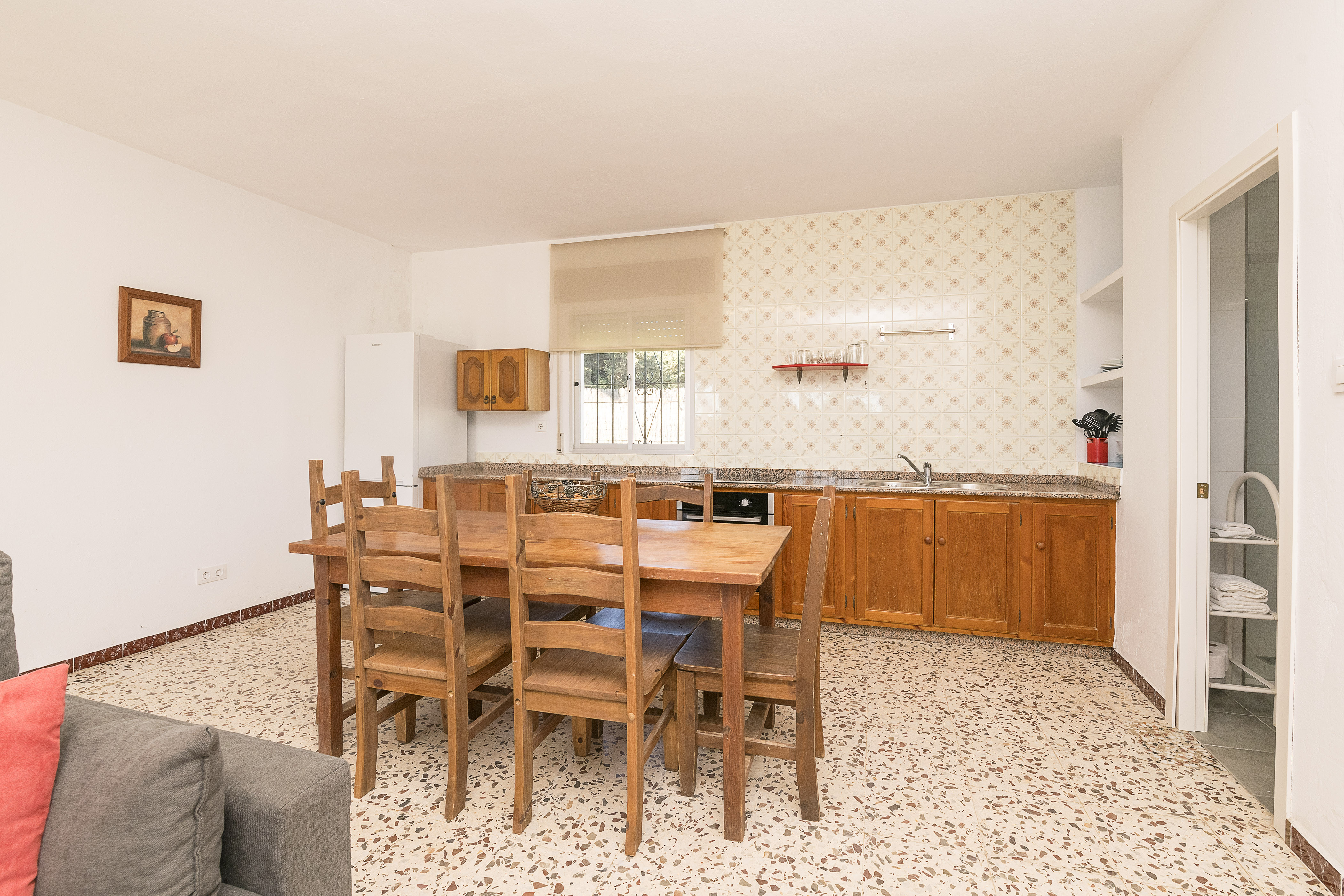 Het interieur van één verdieping biedt een eenvoudige, lichte en zeer gezellige stijl. Bij binnenkomst vinden we de eetkamerkeuken met een tv, een comfortabele bank, een tafel voor 6 personen en een keramische kookplaat. Om uit te rusten zijn er twee slaapkamers, één met een tweepersoonsbed en de andere met twee eenpersoonsbedden, beide met een ventilator om de heetste nachten af te koelen. De twee extra gasten kunnen op de slaapbank voor twee personen verblijven. De enige badkamer in het appartement is uitgerust met een douche. Tenslotte vindt u in de accommodatie een wasmachine, strijkijzer en strijkplank, evenals een kinderbedje en kinderstoel als u met uw baby reist.