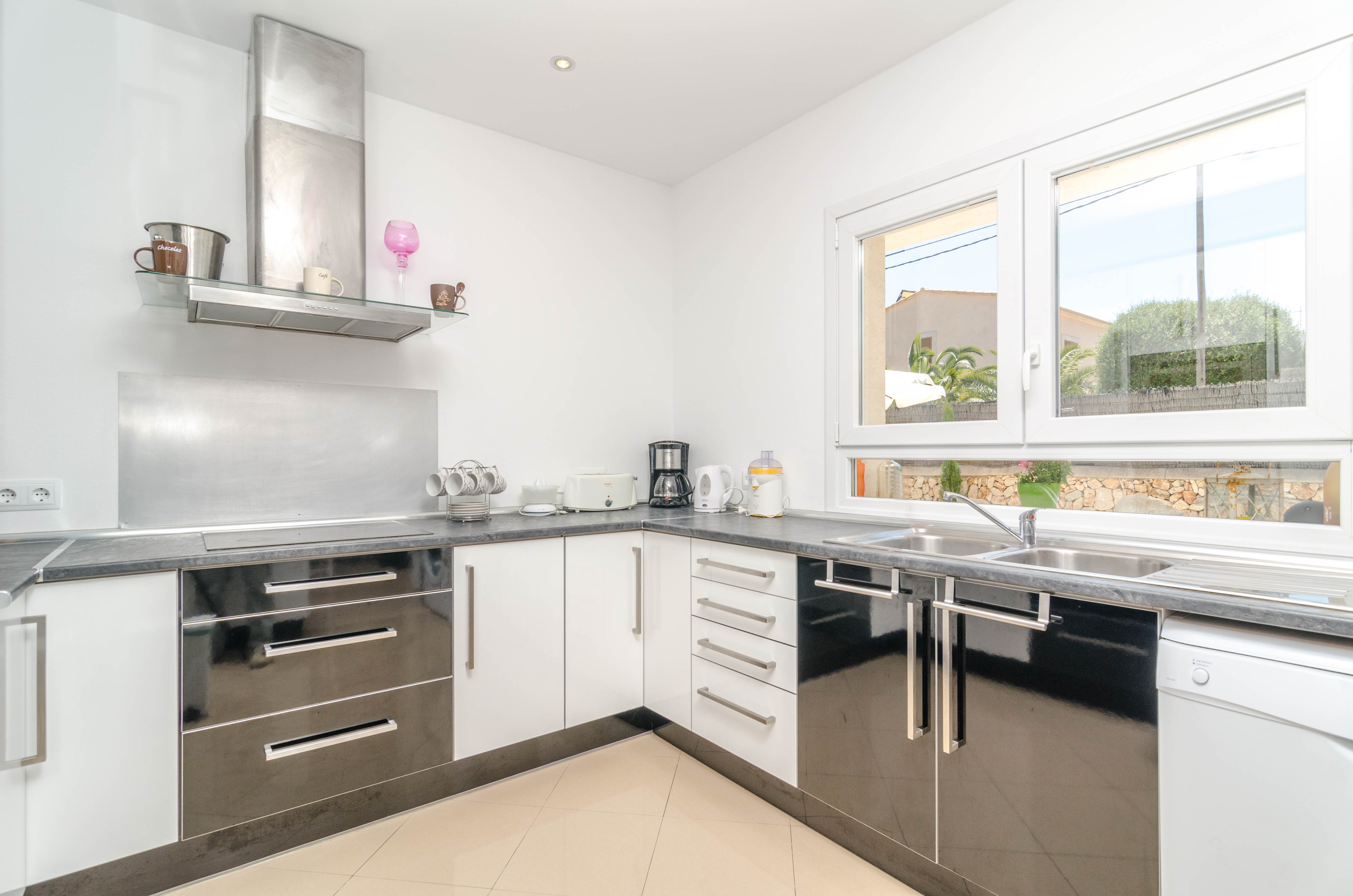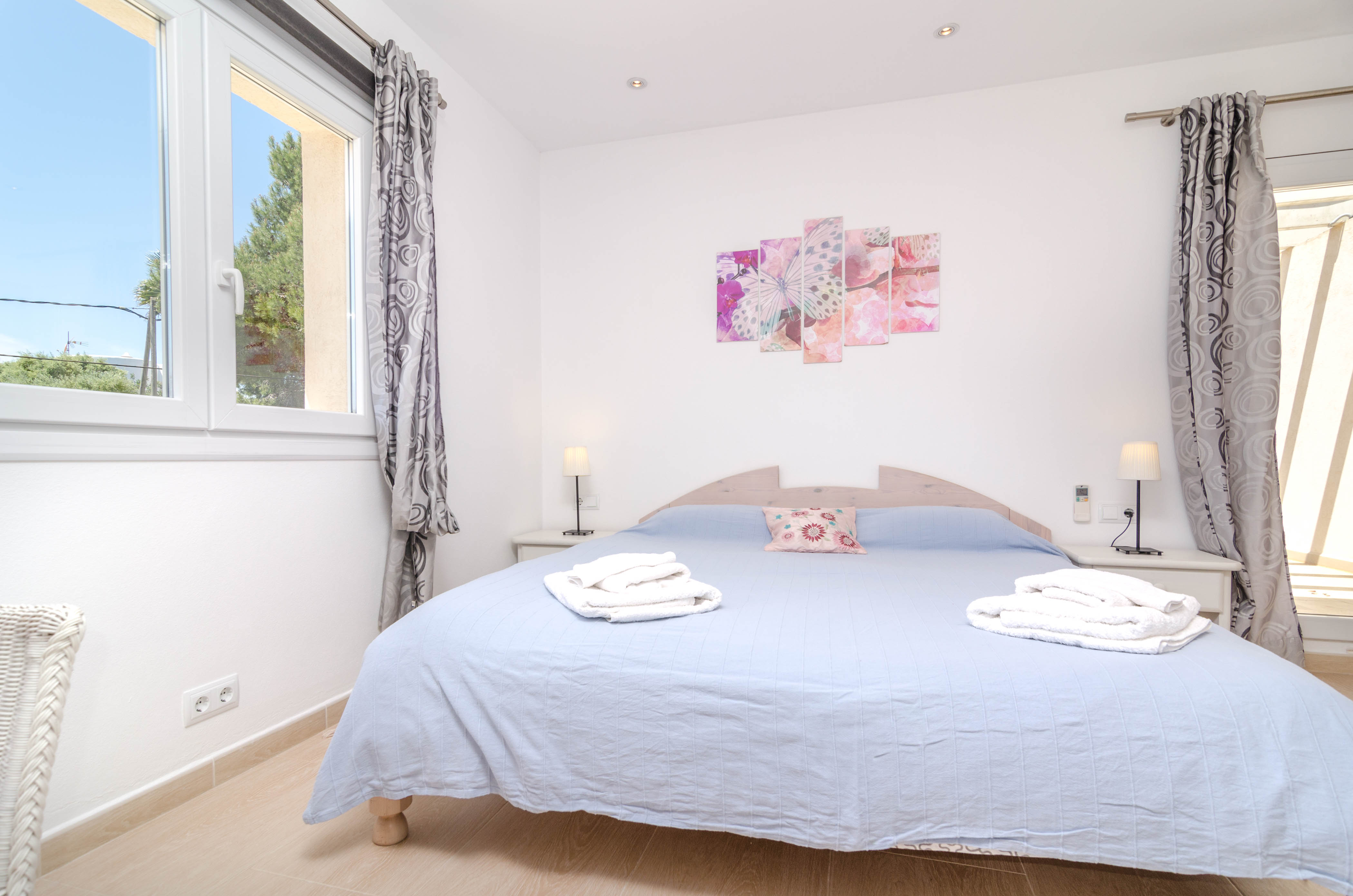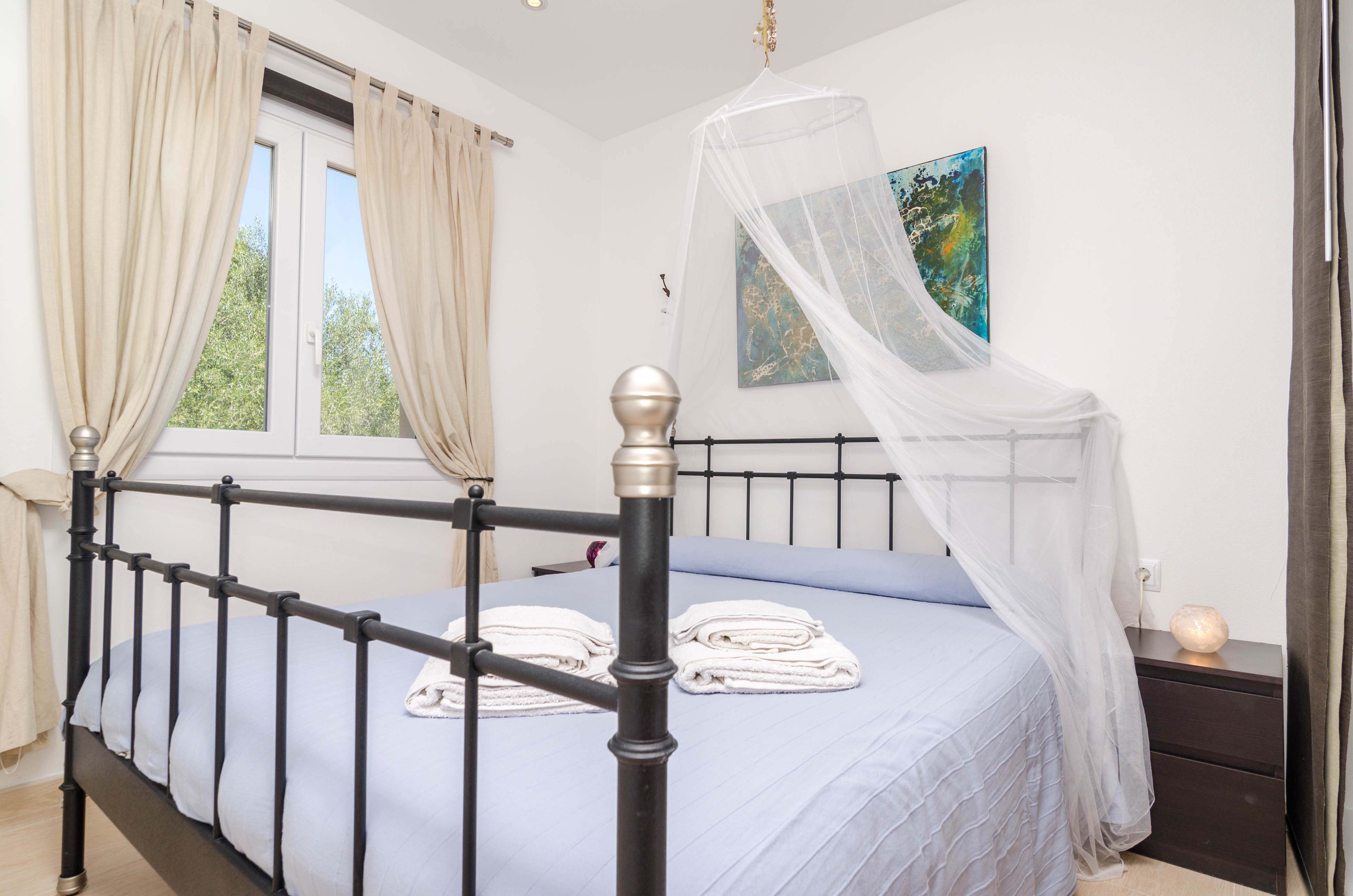 Een kleurrijke, comfortabele zit-eetkamer met airconditioning nodigt je uit om een film te kijken op satelliet-tv, naar muziek te luisteren of te dineren met vrienden. De open keuken met vitro kookplaat is volledig uitgerust en heeft een wasmachine, een strijkijzer en een strijkplank. Drie slaapkamers, twee met een tweepersoonsbed en één met een eenpersoonsbed, bevinden zich op de begane grond. Op de eerste verdieping is alleen een slaapkamer met een tweepersoonsbed en een ruime en-suite badkamer met bad en douche. Naast het en-suite bad is er een badkamer met douche en een bad met bad op de benedenverdieping. Alle slaapkamers hebben airco en kledingkasten en we kunnen een kinderbedje en een kinderstoel klaarzetten voor onze jongste gasten.