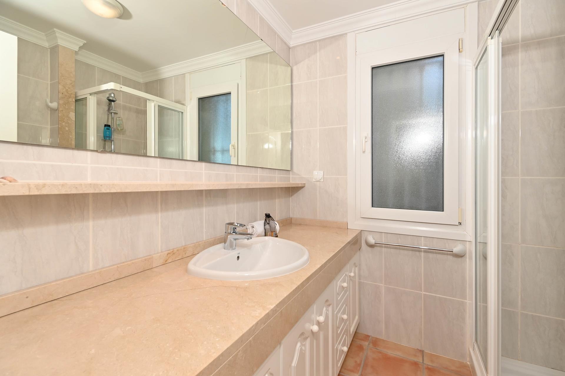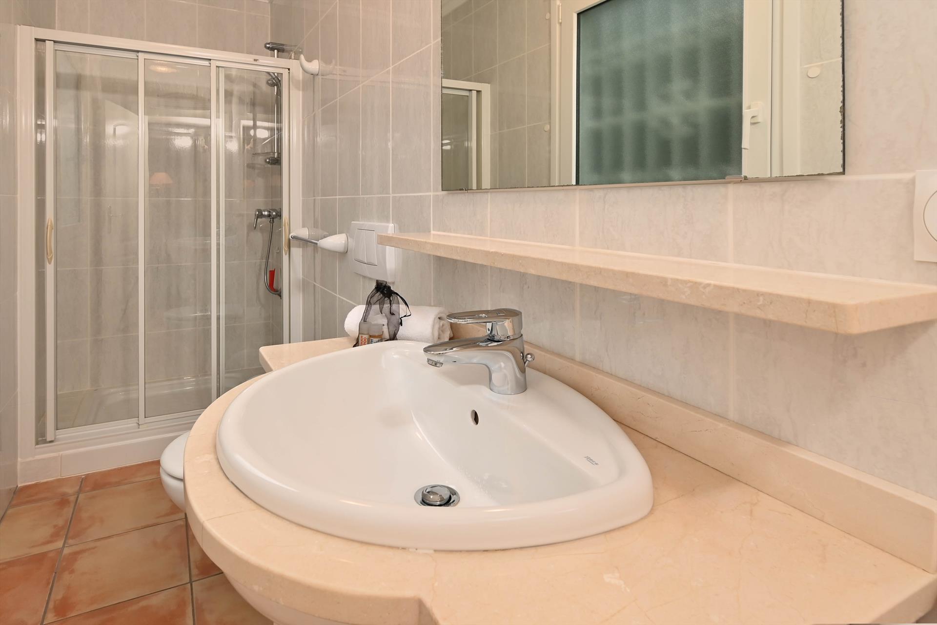 - badkamer met enkele wastafel, douche en toilet